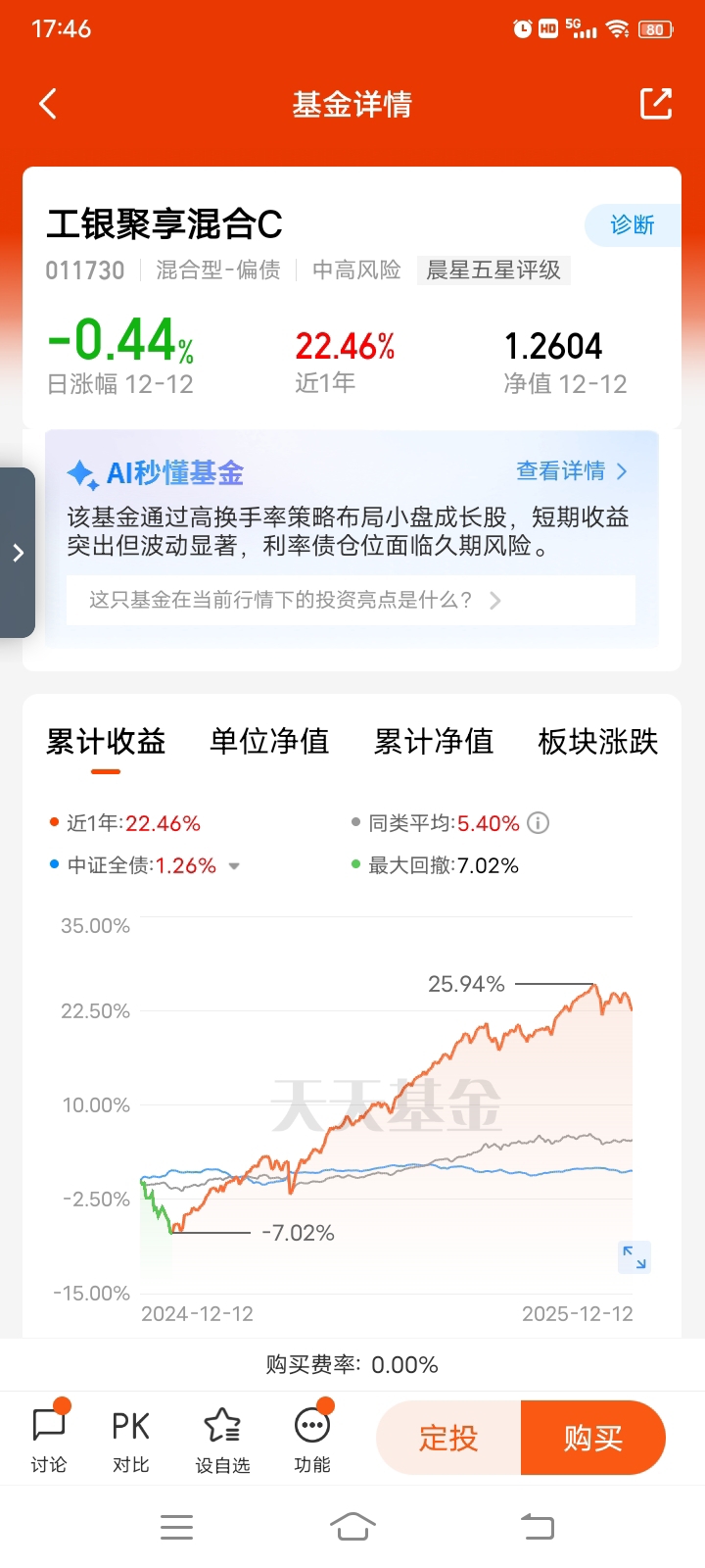 从实际收益来看,这只基金近1年收益达到22.46%,远超5.40%的同类平均,也甩开了中证全债1.26%的收益水平,能明显看出它的权益部分为收益做了实打实的贡献。而且它的最大回撤只有7.02%,在追求高收益的同时,把风险控制在了中高风险的合理范围内,不像纯权益基金那样大起大落,对咱们这种想稳健增值的人来说,这种“进可攻、退可守”的表现特别难得。