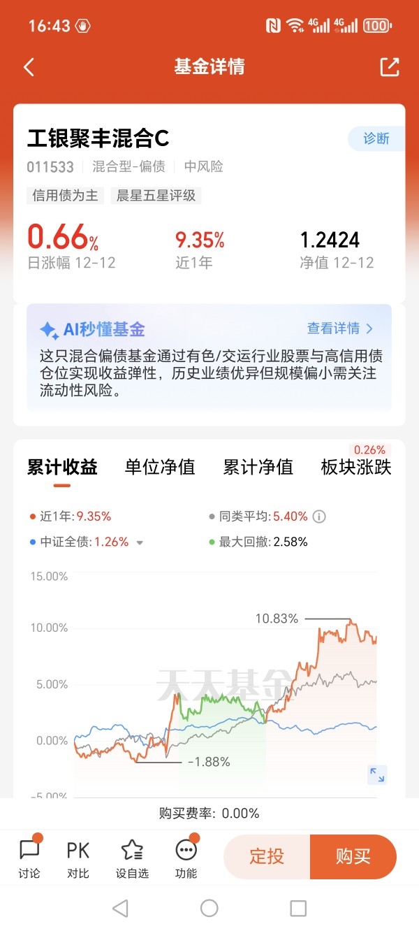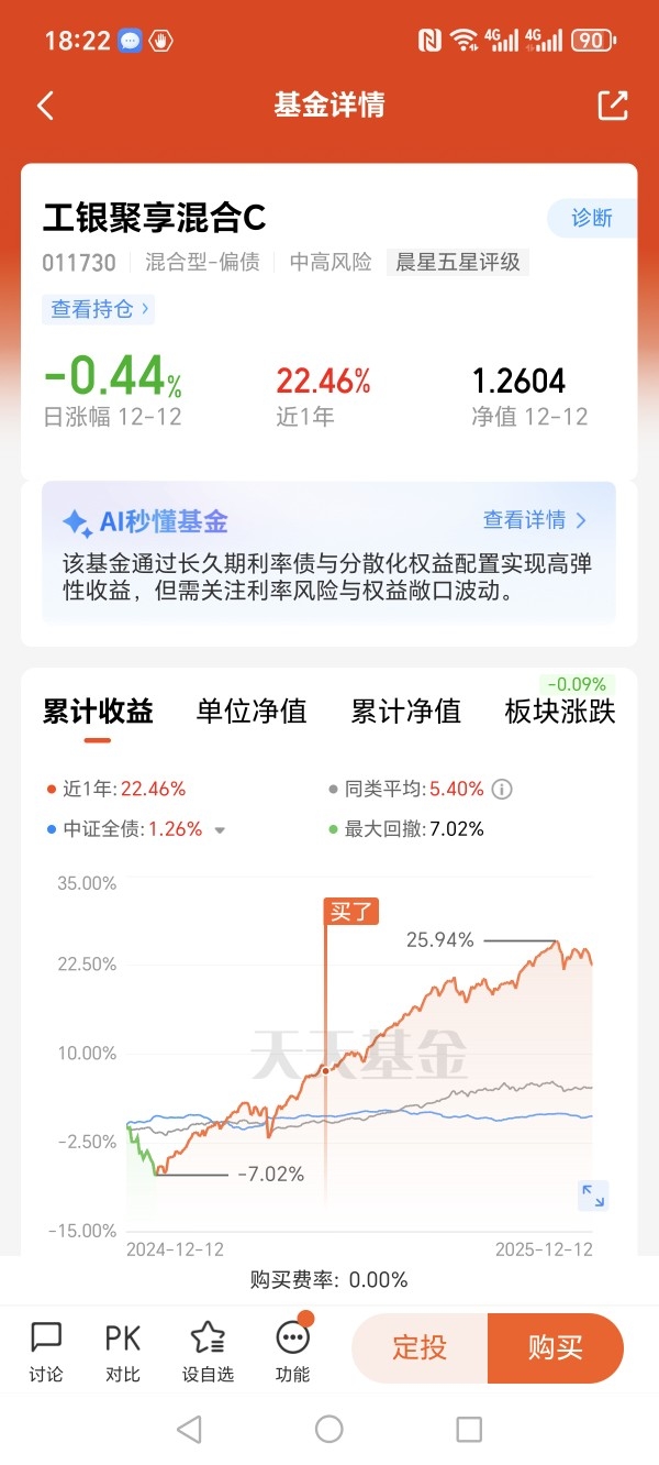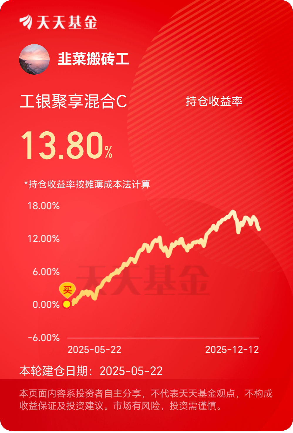 #工银聚焦偏债混#相较股票的大起大落与纯债的低弹性,固收+以资产配置取胜:债为底、股添色,利用股债跷跷板对冲,在震荡市更从容。当下,政策端持续释放稳增长信号,经济修复的确定性逐步增强,而利率长期下行的趋势又让债市的配置价值愈发凸显。在这样的环境下,“固收+”产品既能通过债券部分提供稳定的票息收益,又能借助权益资产捕捉市场向上的弹性,完美契合当下“攻守兼备”的配置需求。工银聚享混合C采用“定量化筛选+分散配置”的策略,既避免了单一资产的过度集中,又能精准捕捉优质标的,C类份额近1年净值增长率达到32.72%,在同类产品中排名前2%,远超同期业绩比较基准6.95%的表现,股市上涨时能分享成长红利,债市调整时又能靠固定收益稳住阵脚,完全不用担心在震荡市里“坐过山车”。基金经理焦文龙拥有多年投资经验,风格稳健扎实,擅长从基本面挖掘长期价值;何顺则是全品类债券领域的专家,对利率走势和信用风险的把控极为精准。两位基金经理的优势互补,形成“1+1>2”的协同效应,让基金的运作更加稳健高效。数据不会说谎,这只基金不仅收益率领先同类,历史盈利概率也相当高,夏普比率优于多数竞品,在回撤控制上的表现非常出色,真正实现“睡后收入”。产品设计上也很贴心,30天免申购赎回费的规则降低了短期交易成本,无论是作为家庭资产配置的“底仓”,还是替代货币基金的升级选择,亦或是中长期资金规划的工具,都非常合适。如果担心一次性买入波动太大,不妨试试定投的方式,通过“低买高卖”平滑成本,进一步降低波动,让财富在时间的沉淀中慢慢增值。