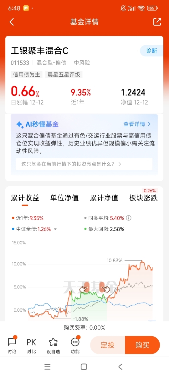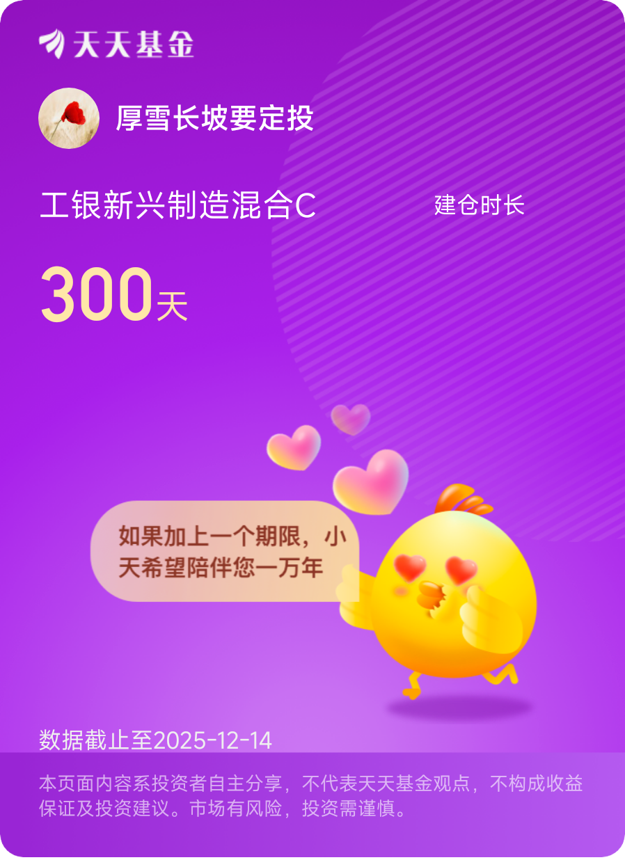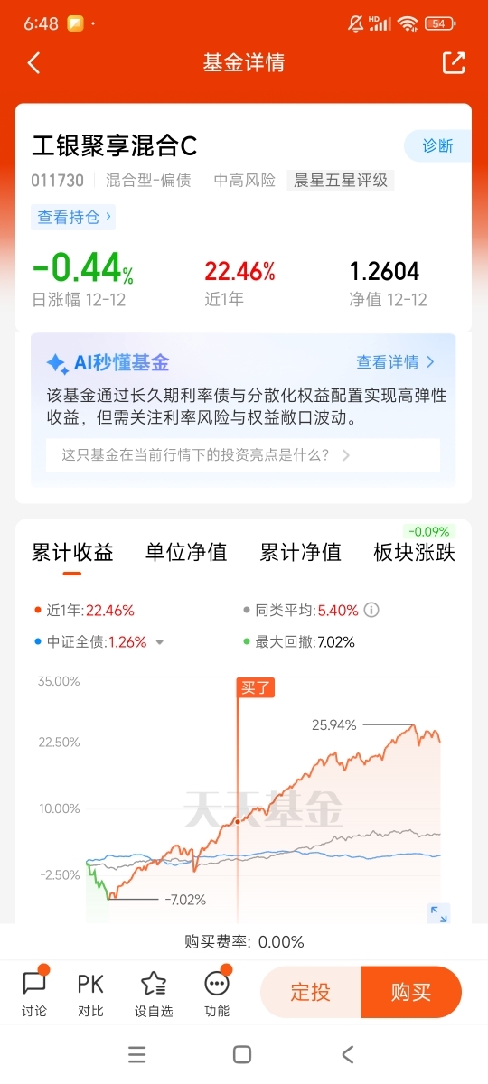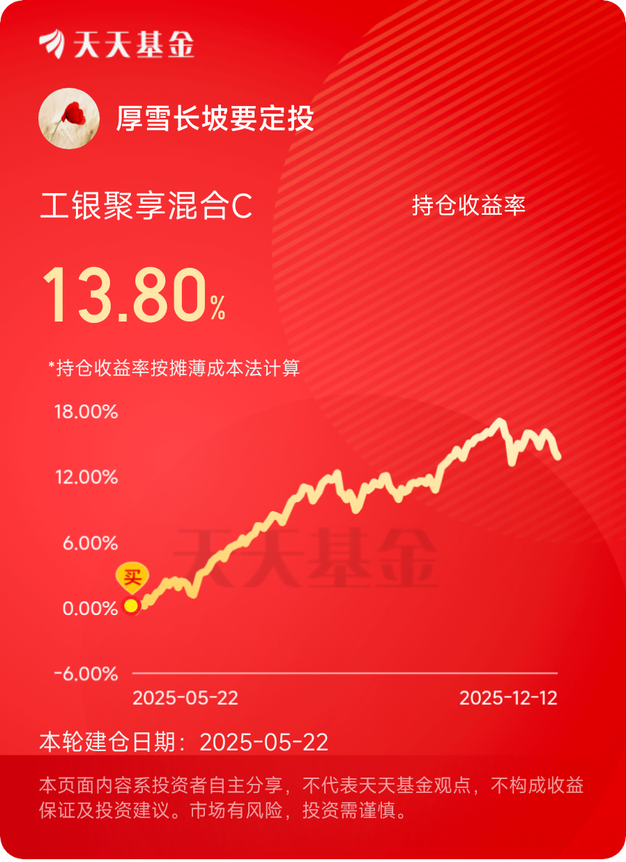 #工银聚焦偏债混#我始终在寻找一种能让我买完安心睡大觉的配置方式。从A股角度看,政策底、市场底与基本面底三底叠加的态势日益清晰,这意味着长期布局的窗口可能正在打开。与此同时,利率长期下行的趋势也较为明确,这让传统存款和货币基金的吸引力下降,却凸显了债券资产的长期配置价值。在这样的环境下,将资产全部押注于单一市场如同走钢丝,必须做好资产配置。而固收+以债券资产提供稳定收益,好比汽车的油箱,用权益资产争取超额收益,如同燃油宝,力求达到进可攻退可守的效果。在众多产品中,我选择了工银聚享混合C。它采用定量化筛选+分散配置的策略,不依赖主观押注,而是通过模型在全市场科学选股,有效分散风险。其近1年净值增长率达32.72%,排名居同类前2%,远超6.95%的业绩基准,超额收益显著。这背后离不开强大的双基金经理团队:焦文龙拥有多年经验,风格稳健,擅长基本面研究;何顺则是全品类债券专家。他们各展所长,形成了1+1>2的协同优势,共同管理着这股稳稳的幸福。数据也支撑了我的选择:它不仅收益率持续领先,历史盈利概率高,其夏普比率(衡量收益风险比)也优于多数竞品,历史回撤控制表现出色,力求让持有人不在震荡市坐过山车。产品设计也很贴心,持有30天以上免赎回费,鼓励中长期投资,减少了我的交易顾虑。在我的规划里,它完美适配多个场景:一是作为家庭资产配置的可靠底仓,打下稳健根基;二是作为货币基金的升级替代方案,在兼顾流动性的同时追求更高收益;三是用于子女教育、养老等中长期资金规划。我尤其推荐采用定投方式布局,通过分批买入平滑波动,低位积累更多份额,是践行低买高卖纪律的好帮手。