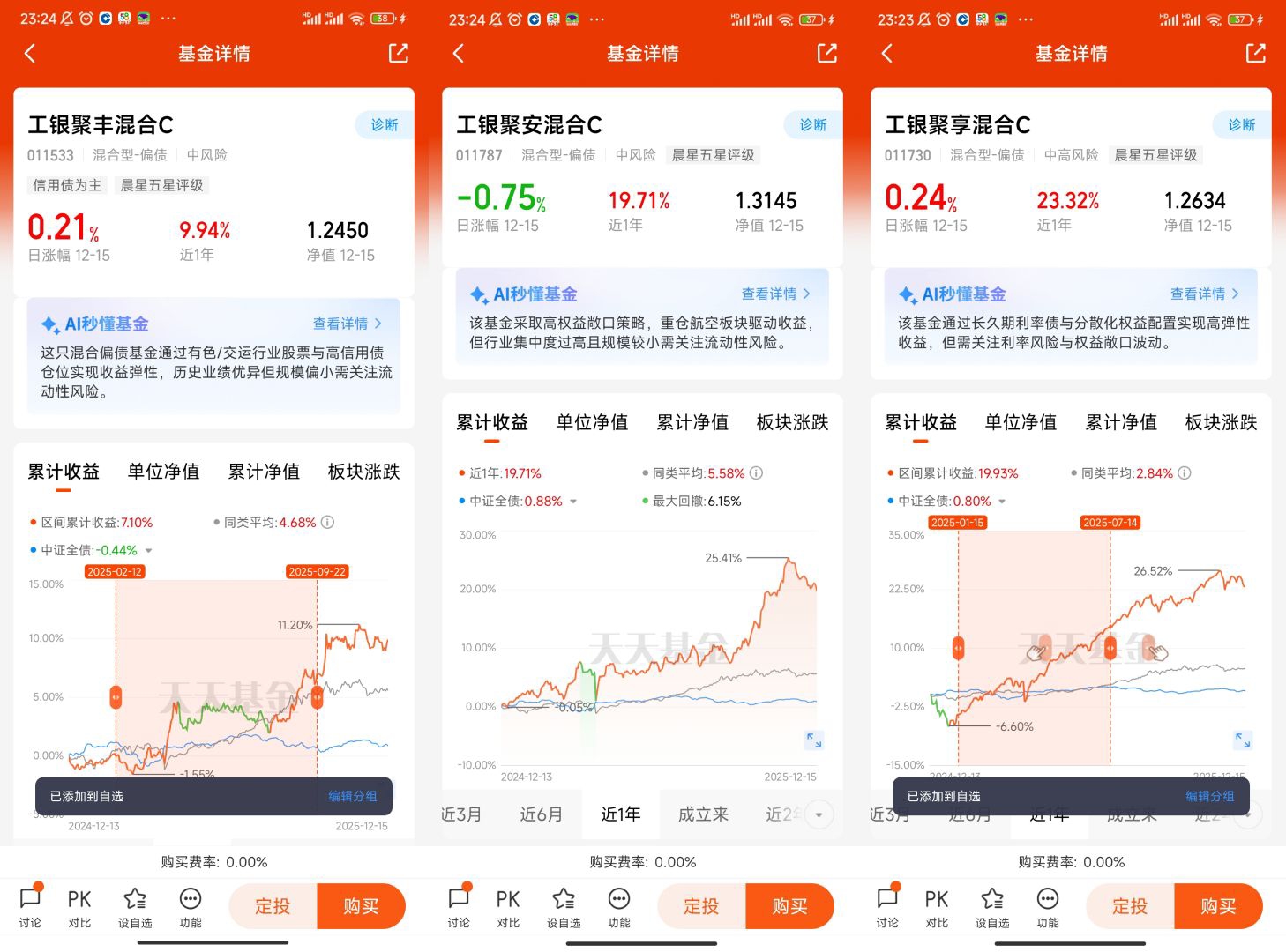 #工银聚焦偏债混# 工银这几只偏债混基金,各有各的好处,能对上车不同人的需求。工银聚安是“低估价值+固收”,还能买港股,稳当里能多赚点海外的钱;工银聚丰是“均衡价值+固收”,股债配得匀,不管市场咋动都抗造;我选的工银聚享混合C,核心就是“量化+固收”,说直白点就是“靠机器算着买,主打一个稳”。