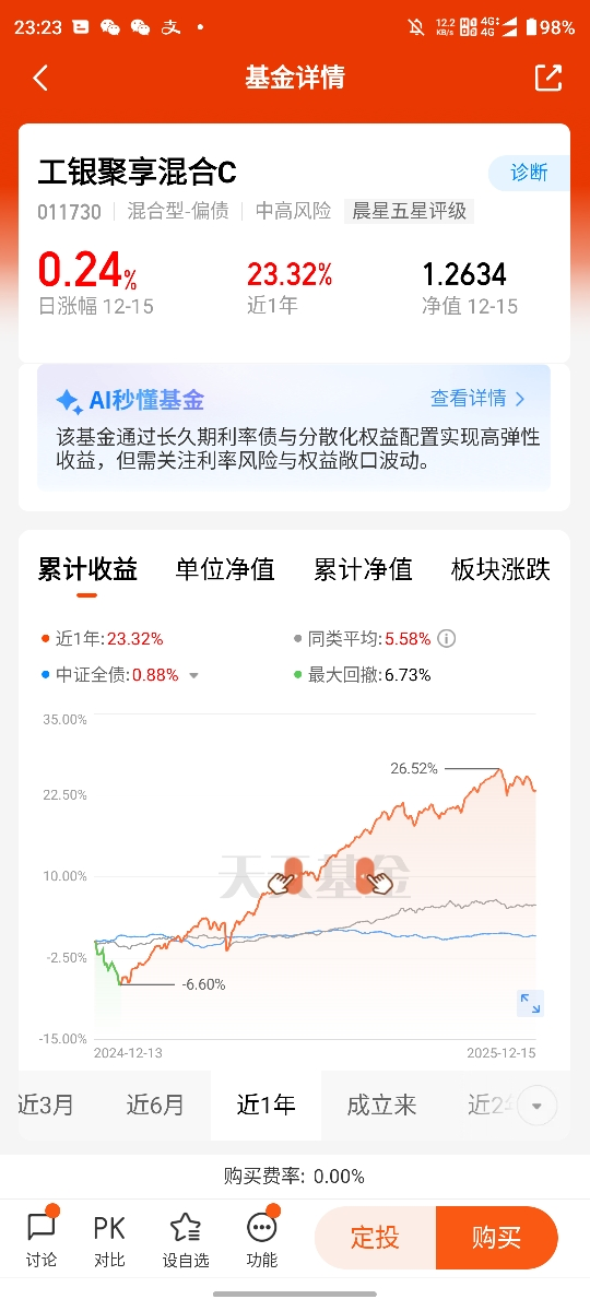 所以,工银聚享C就像一个“稳健理财+智能炒股”的组合。它既有债券的安稳,又有量化策略带来的额外收益机会,特别适合咱们这些不想花太多心思研究,但又想让钱能比银行利息跑得快点的普通人。如果你想找一个省心、稳健、还能有点惊喜的投资,它是个不错的选择。