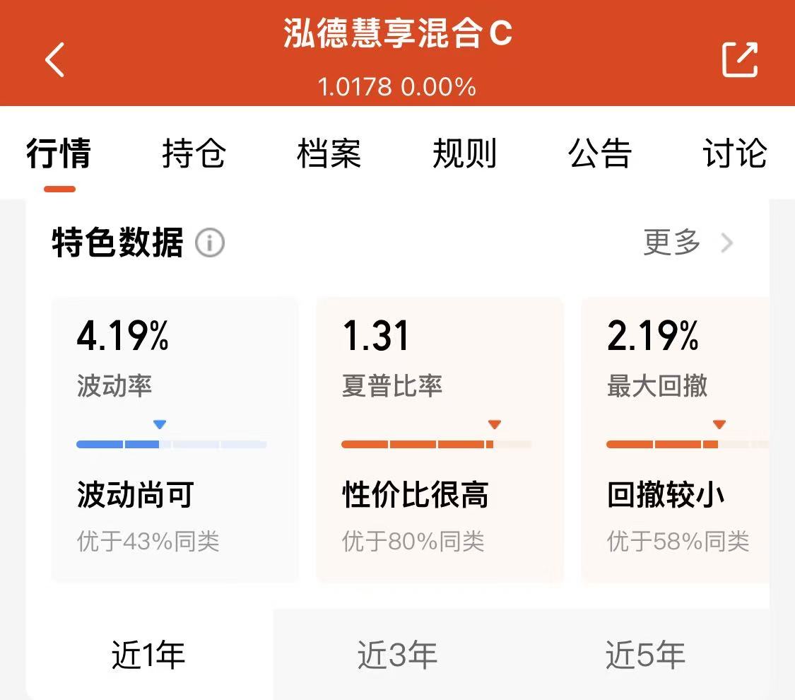 (2)收益率稳:泓德鑫欣混合A(010923)“近1年”的收益率达到了7.44%,在1283只同类基金中排名高达第297位,超过大多数同类“混合型-偏债”的表现,夏普比率高达1.42,“性价比很高,优于84%同类”。