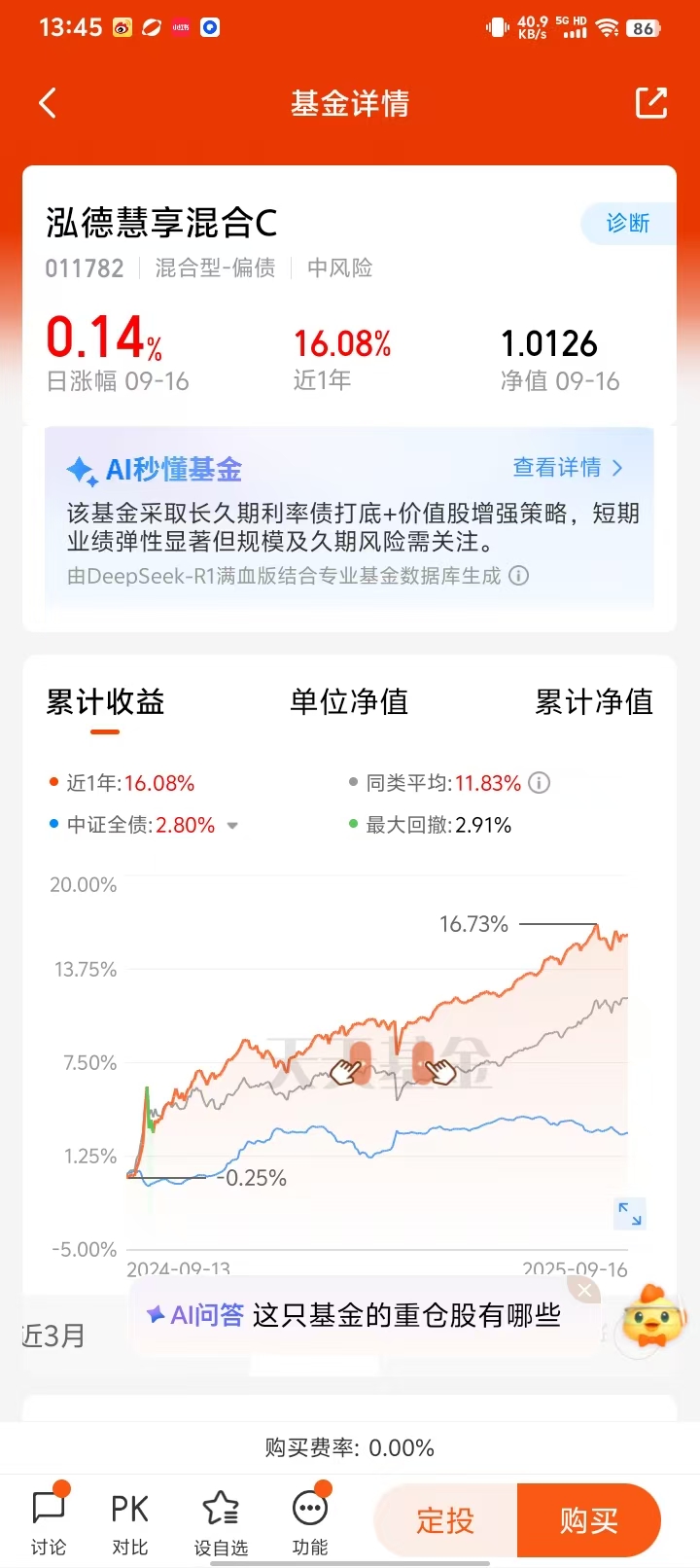 如果现在主要持有债基,希望适度提升收益潜力、接受小幅波动的资金(如家庭备用金、中期理财资金),不妨可以考虑加仓或配置一部分资金到“固收+”基金。比如泓德慧享混合(A:011781,C:011782)这类优秀的偏债混合型产品,从容应对市场变化。@泓德基金