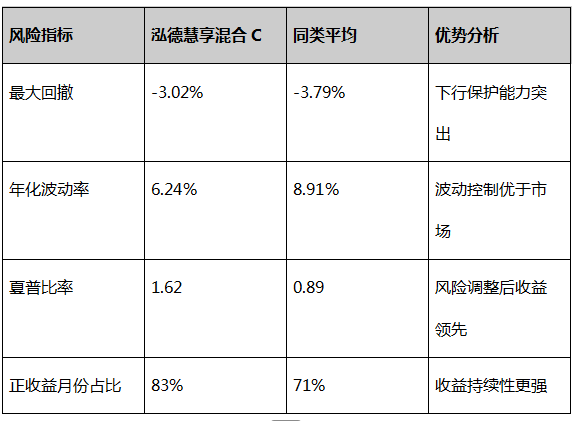 基金构建了多层次风控体系,关键指标全面优于同类。从绝对风险指标看,近一年最大回撤-3.02%,低于同类平均-3.79%,且回撤恢复周期缩短至27天,优于同类近9成的基金。波动率控制尤为突出,年化波动率6.24%仅为股票型基金的1/5,与纯债基金7.1%的水平相当。这种低波动特性使产品夏普比率达1.62,位列同类前5%,单位风险收益回报显著优于平衡型基金平均水平(夏普比率0.89)。
