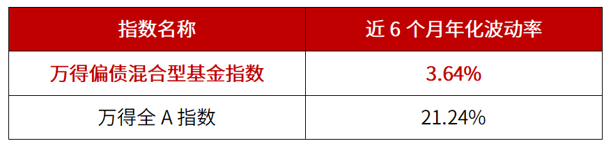 作为一种融合了固收与权益类资产的投资工具,偏债混合产品力争通过巧妙搭配股+债两种资产,平滑单一市场的风险,通过多元化配置力争实现“稳中有进”的收益目标。以今年波动市为例,万得偏债混合型基金指数近6个月的年化波动率为3.64%,明显低于万得全A指数。