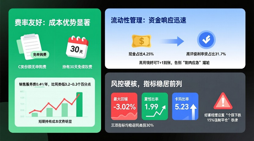 - 费率友好:C类份额无申购费,持有30天免赎回费,销售服务费0.4%/年,比同类低0.2-0.3个百分点,短期持有成本优势明显。