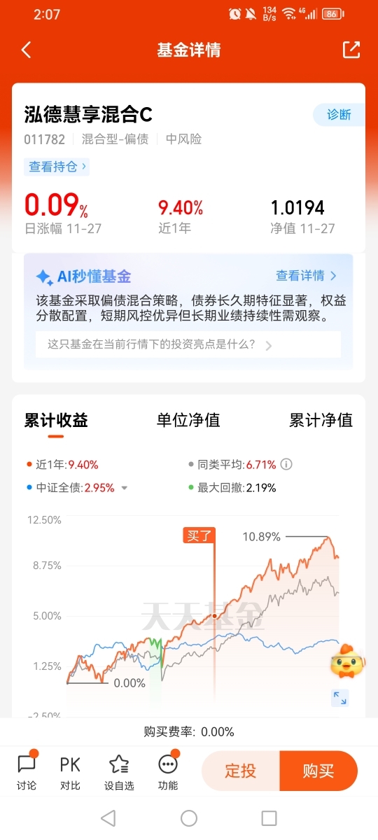 作为一名普通投资者,我对基金的核心诉求很简单:风险可控、收益稳健、持有舒心,而泓德慧享混合C恰好精准契合了这些需求。今年市场波动不小,不少产品起起落落,但这只混合偏债基金却像一位沉稳的领航者,凭借偏债为主、灵活择股的策略,既规避了权益市场的大幅波动,又通过精选个股带来了超额收益。翻开持仓记录,无论是季度分红的稳定到账,还是长期以来稳步向上的净值曲线,都让我感受到“稳稳的幸福”——它没有轰轰烈烈的短期暴涨,却用持续向好的表现,悄悄兑现着“穿越周期、稳健增值”的承诺。