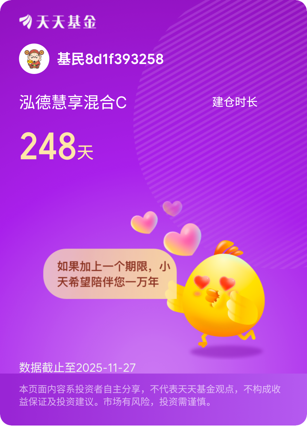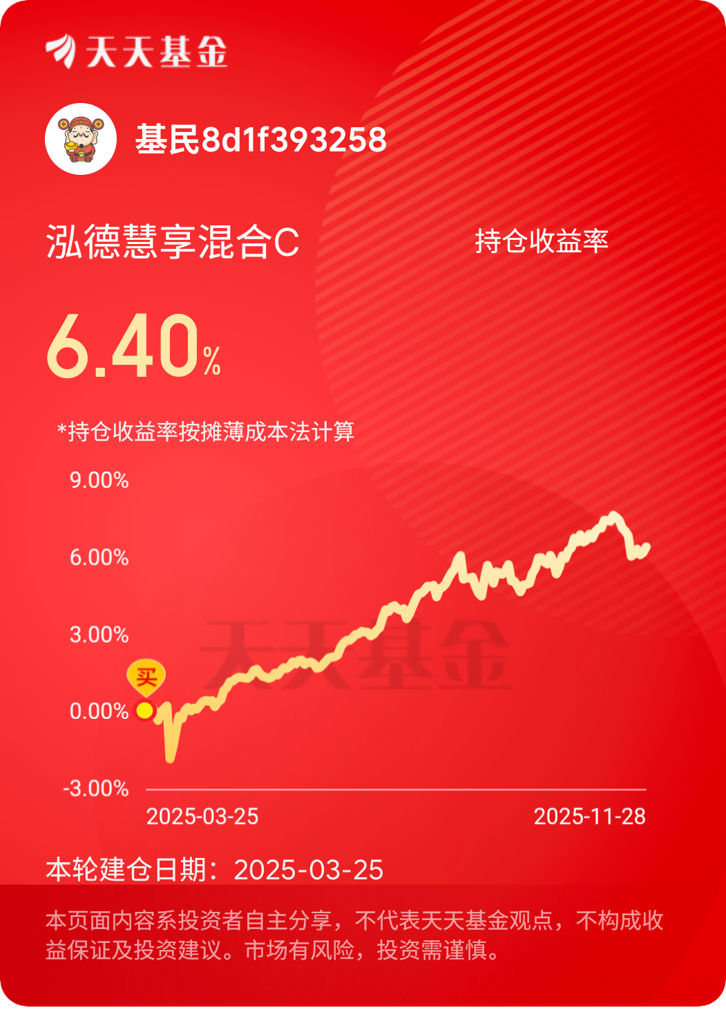 最后,我也想把泓德慧享混合C推荐给和我一样的普通投资者。如果你和我一样,在科技、贵金属等高波动板块里摸爬滚打后,想要找一个能平衡收益与风险的产品;如果你是刚入门的新手,不想承受太大的投资压力,又想获得比银行理财更高的收益;如果你是稳健型投资者,想给家庭资产找一个靠谱的“增值渠道”,那么泓德慧享混合C值得一试。它或许不会让你一夜翻倍,却能在漫漫投资路上,用稳健的步伐,陪你走过一个又一个市场周期。毕竟对我们普通人来说,投资的终极目标不是追求极致收益,而是在风险可控的前提下,让财富慢慢增值,而泓德慧享混合C,恰好能实现这个心愿。@泓德基金 #晒收益#