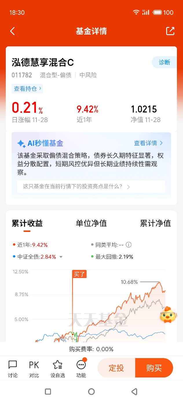 作为$泓德慧享混合C$的长期持有人,在基金投资的这些年里,我踩过科技板块暴涨暴跌的坑,也试过在贵金属行情里追涨杀跌,兜兜转转后,反倒在这只固收+风格的混合基金里,找到了稳稳的幸福感。截至目前,这只基金给我带来了6.4%的投资收益,不算惊天动地,却让我实实在在感受到了“细水长流”的力量,也让我坚定了长期持有、择时加仓的决心。