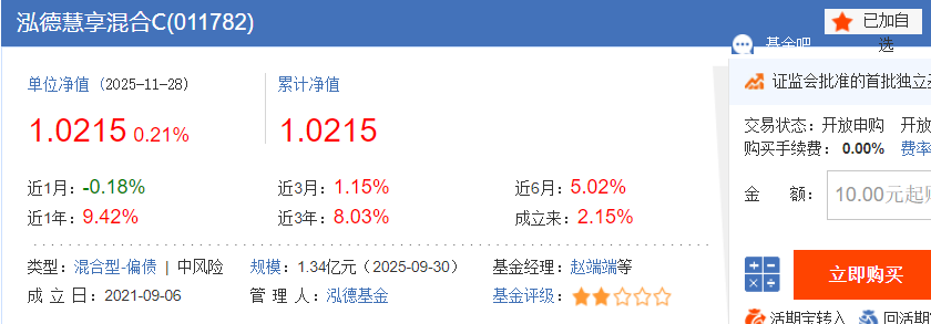 截至 2025 年 11 月 28 日,泓德慧享混合 A 最新净值为 1.0273,日涨跌幅 0.21%,近 1 个月波动 - 0.15%,近 3 个月波动 1.25%,近 6 个月波动 5.23%,近 12 个月波动 9.86%。从历史业绩来看,该产品展现出 “涨得多、跌得少” 的核心优势,尤其是在市场调整期的抗跌能力表现突出。