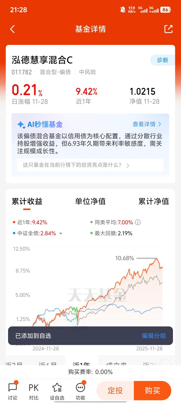 我期待泓德慧享混合C带来的不是一夜暴富的惊喜,而是持续稳定的增值体验。从历史表现看,该基金近一年收益率达11.86%,在同类偏债混合基金中排名前16%。这种“不急不躁、稳步前行”的特质,正是我在当前震荡市中最需要的。
