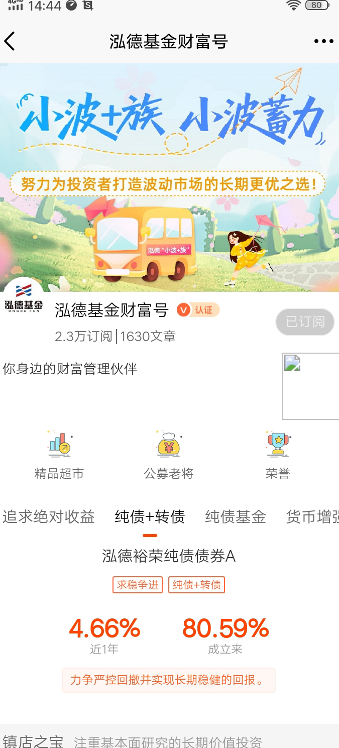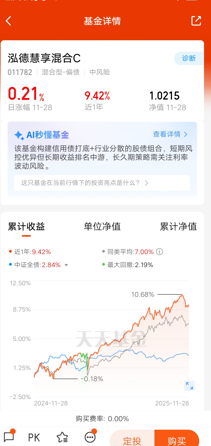 $泓德慧享混合C$ 以债券资产打底,获取稳定收益,股票以红利风格打底+小盘成长增强,股票资产不超过30%。截止到今天,近1年收益率9.42%,波动率4.18%。夏普比率1.89%,优于85%同类。最大回撤2.19%,回撤幅度比较小。@泓德基金