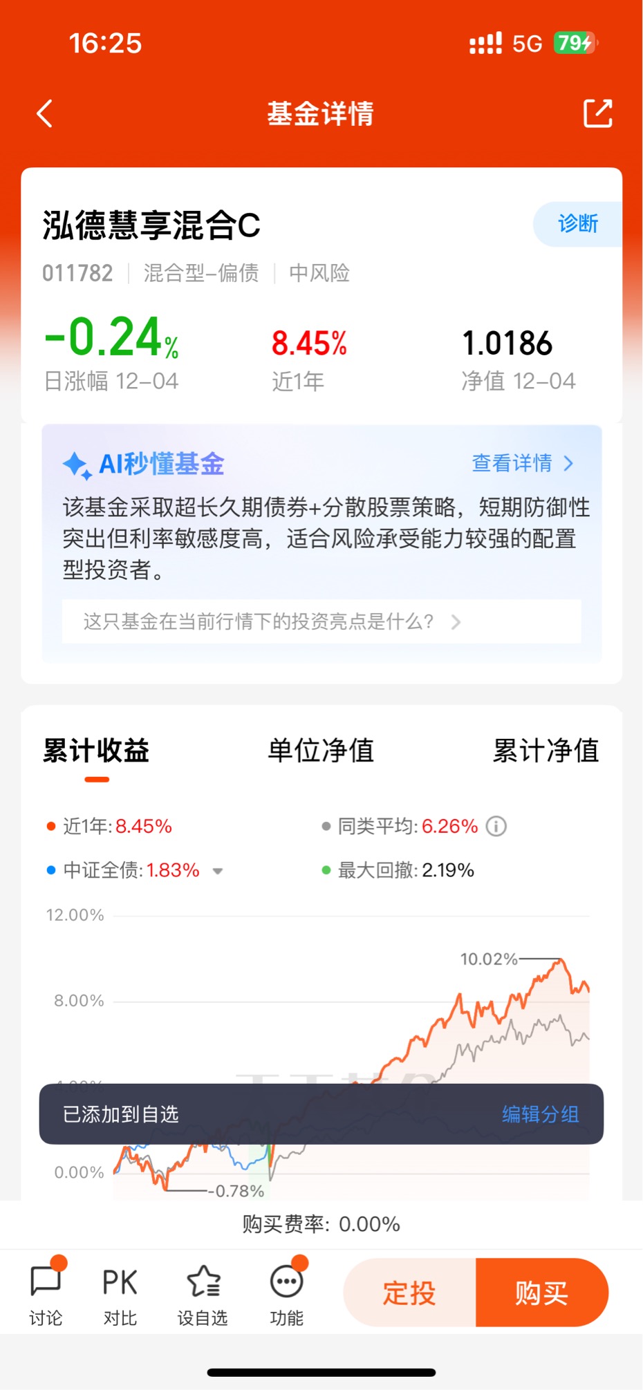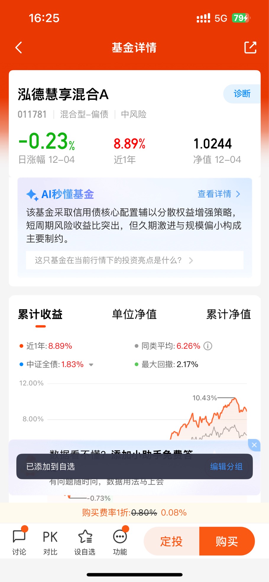 对我来说,这类产品的核心诉求首先是“稳”。泓德慧享混合的固收打底策略刚好踩中了我的需求——它始终坚守信用不下沉的底线,不会为了追求短期收益去触碰高风险信用债。这一点在债市偶尔出现波动的行情里,显得格外重要。我不需要它在固收部分带来多惊艳的收益,只希望这部分能像“压舱石”一样,给整个组合托住基本盘。