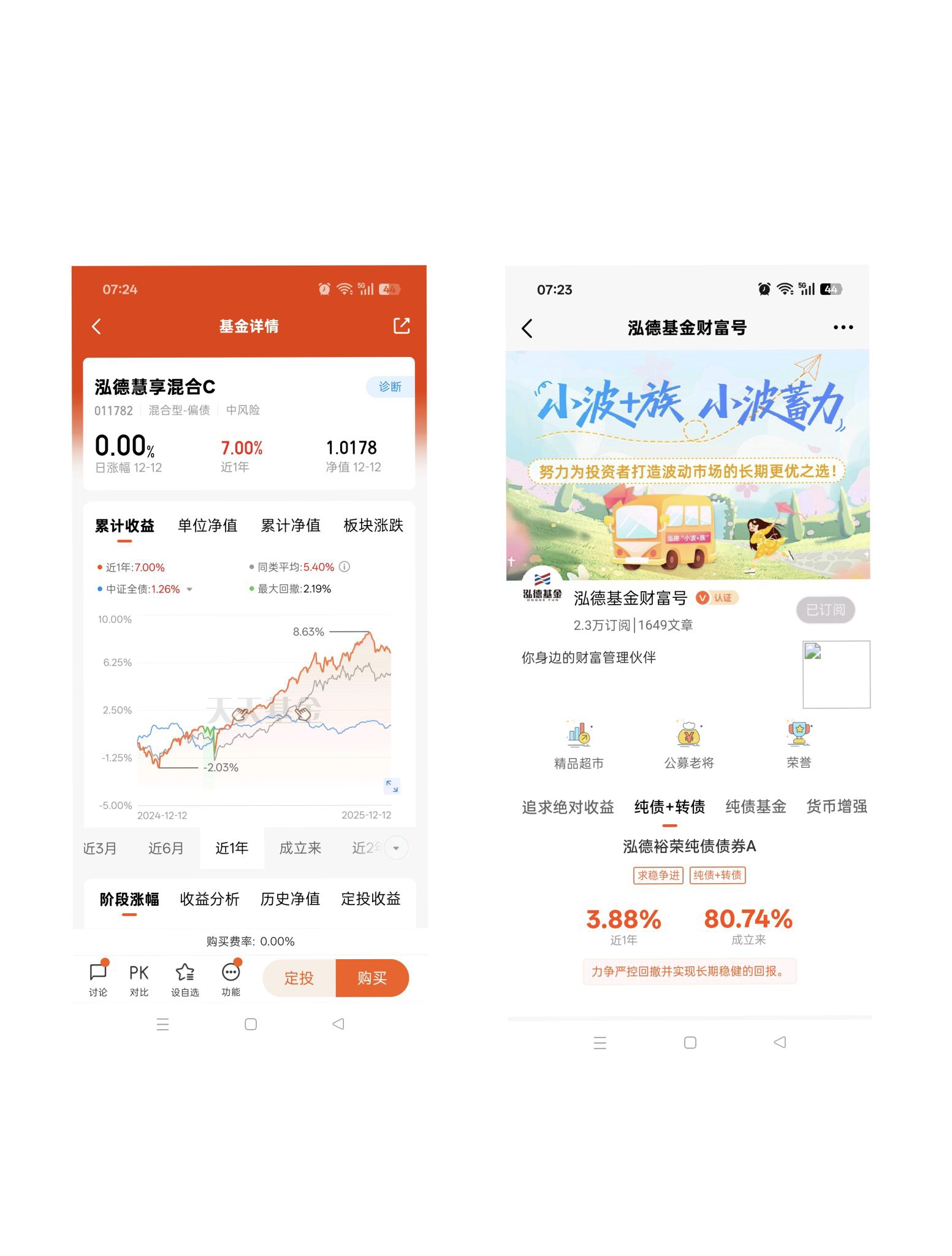 泓德慧享混合C作为固收产品,70%配置债券,作为固收构建安全垫,30%配置权益资产,采取红利+小盘成长风格,进一步分散风险,增加基金的稳定性。泓德慧享混合C近两年一直保持上行态势,近两年收益11.14%,近一年收益11%,近六个月收益3.94%,长期业绩优异,而且抗跌性强,近期回撤幅度非常小,用于应对当前股市震荡格局,是非常好的选择。@泓德基金