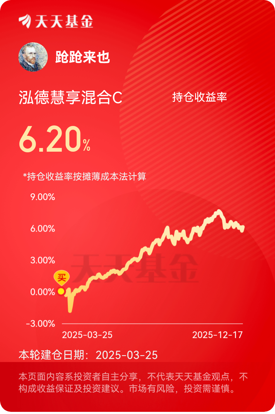 持有$泓德慧享混合C$ 的日子里是温暖的,一路平稳上涨,就像太阳一样,照耀投资道路。从买入到现在,持仓盈利已经达到6.2%,感谢