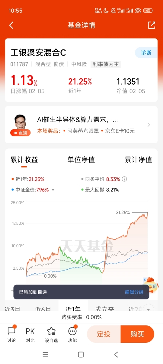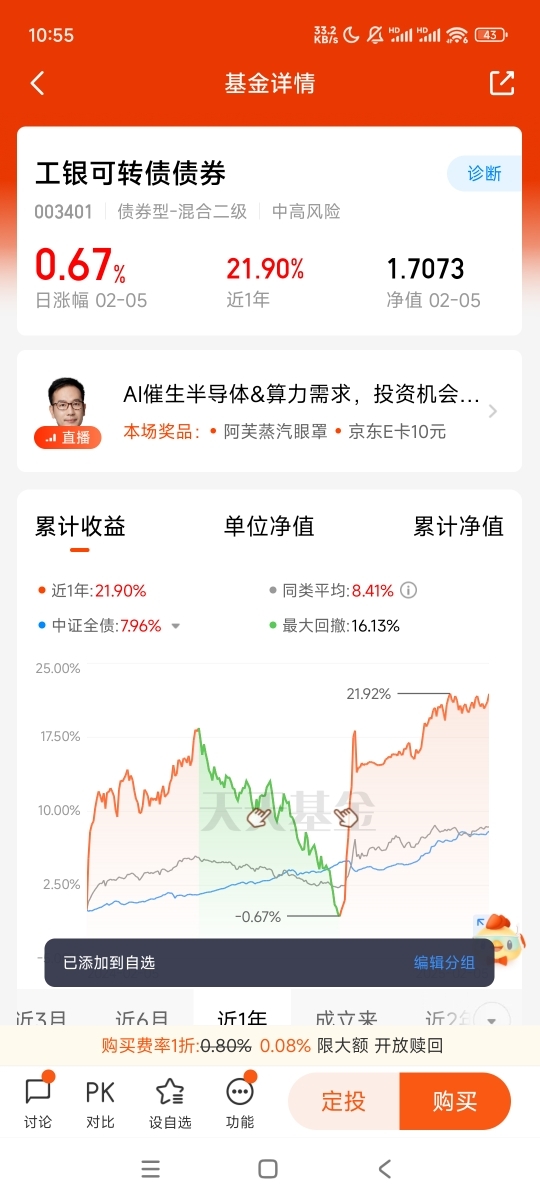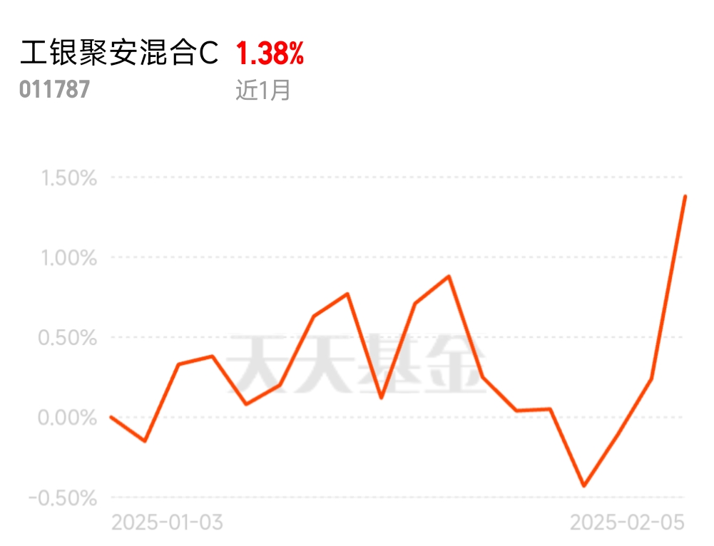 #宝藏基#打卡第一天 昨日开盘债市低开后高走,可转债表现也相当给力,$工银聚安混合C$ 近一个月涨幅1.38%,整体呈现震荡上行趋势,适合逢低布局,已经加自选观察啦,行情变化莫测,等待机会逢低布局即可