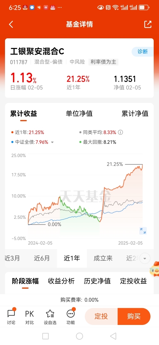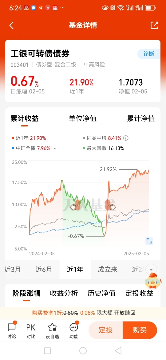 工银家有一个符合这个特点且有历史表现作为参考的产品﹣工银聚安混合,近一年收益率达到两成。与收益比,其控制回撤抓反弹的机会是不错的,总体呈现债市重要回调点跌相对较少,但市场机会回暖时涨更多的情况。当然除了经理的择时,也可能与股债有对冲效果有关。