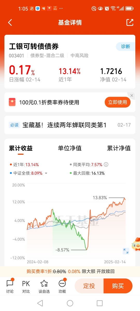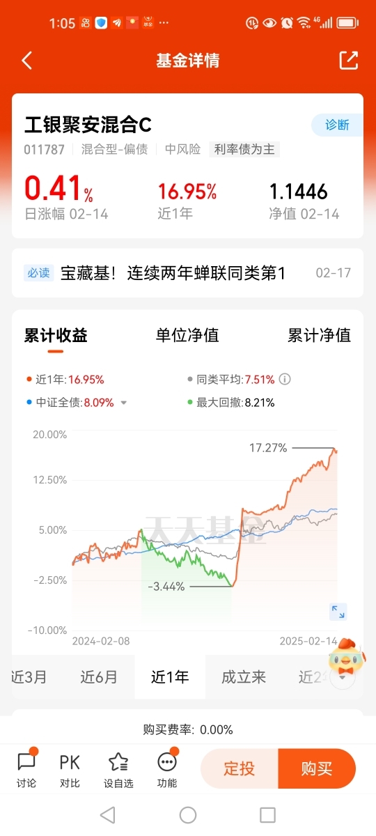 打卡第1天。$工银聚安混合C(011787)是只偏债混合型基金。该基金股票、可转