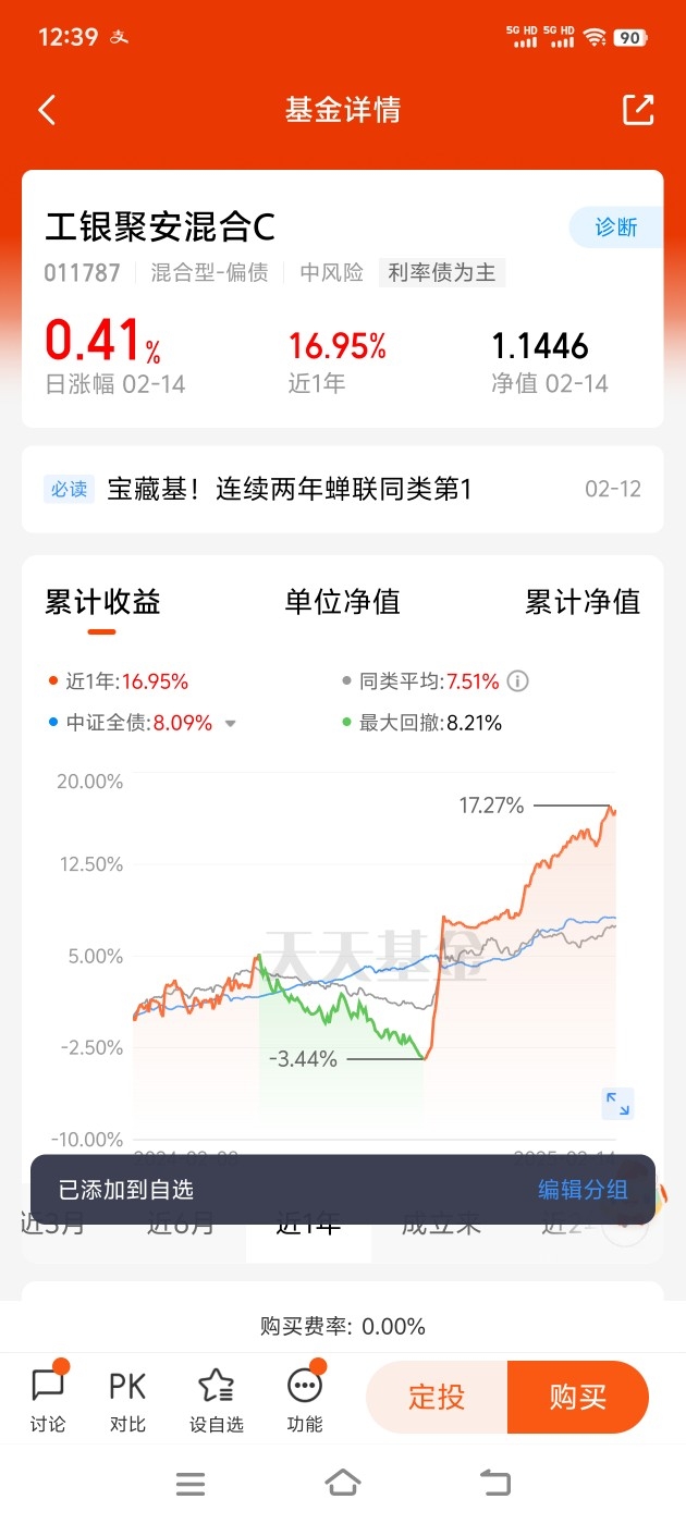 $工银聚安混合C$ 在资产配置上,以93.13%的仓位配置利率债及少部分可转债,为基金提供了稳定的收益基础和抗风险能力。同时,39.8%的权益增强股票仓位,且优选A股港股优质资产,又为基金增添了获取更高收益的潜力。这样的股债搭配,使得基金在不同市场环境下都能有相对稳定的表现,进可攻、退可守。该基金过往业绩十分出色,近一年净值增长19.07%。