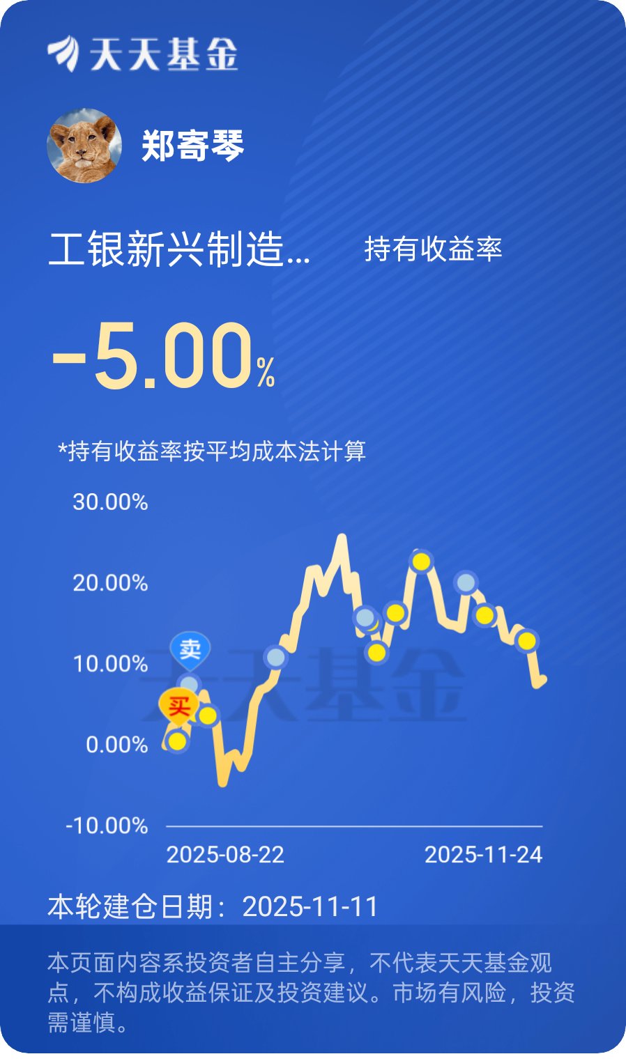 先说说我持有工银新兴制造混合 C 的现状,这只基金聚焦科技成长赛道,近 12 个月涨幅高达 55.09%,弹性十足但波动也很明显,11 月 21 日单日跌幅就达 4.40%,近一个月更是下跌 7.48%,在市场震荡时很考验心态。作为一只偏成长的基金,它的持仓集中在半导体、AI 算力等高景气领域,虽然长期收益亮眼,但行业周期波动带来的回撤风险也不容忽视,需要一只稳健型产品来中和这种波动。