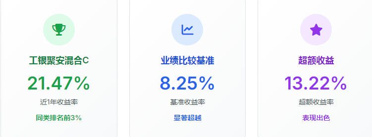 工银聚安混合C的业绩表现令人瞩目。近1年净值增长率达到21.47%,远超同期业绩比较基准8.25%, 超额收益显著。在同类偏债混合型基金中排名居前3%,这一成绩在当前震荡的市场环境中实属不易。 这样的业绩表现,充分证明了基金经理的投资管理能力和策略的有效性。