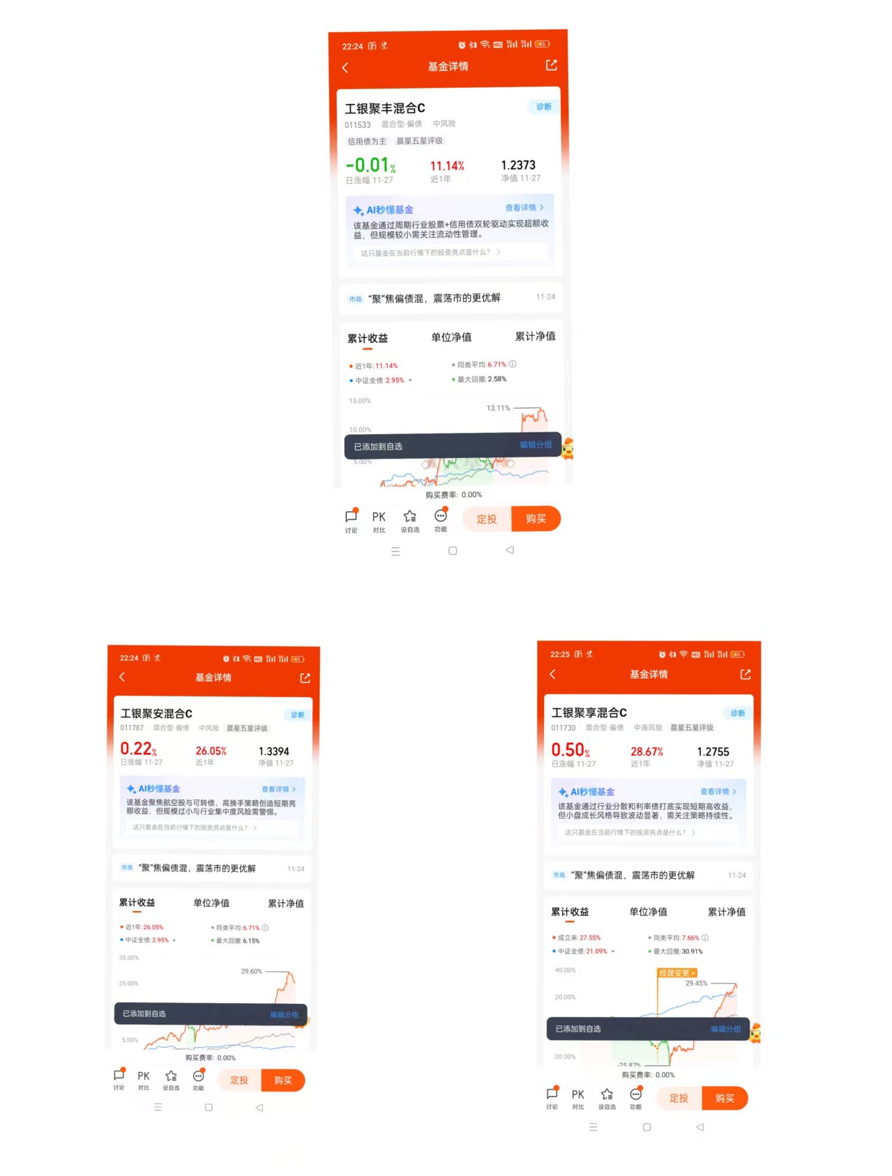 权益部分则是基金的"收益引擎",基金经理精选优质个股、把握行业轮动机会,在股市上涨时为组合增厚收益。 特别是在政策支持的结构性行情中,适量的权益持仓可能带来可观回报;而当股市调整时, 因仓位有限且主要配置于低估价值股,损失也相对可控。这种灵活配置让偏债混合基金既能跑赢通胀, 又能避免纯债基金收益偏低的局限。工银聚安混合C通过精准的股债配置,实现了风险收益的最佳平衡。