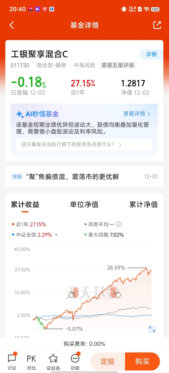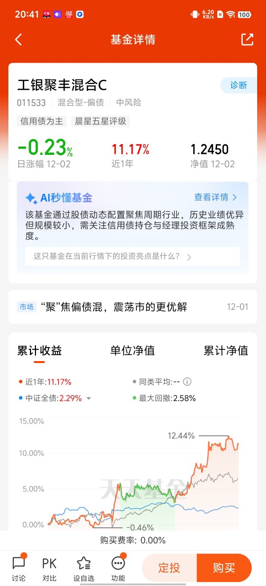 看好$工银聚安混合C$,股债搭配,投资更好。这只基金投资了低估值的股票,具有更高