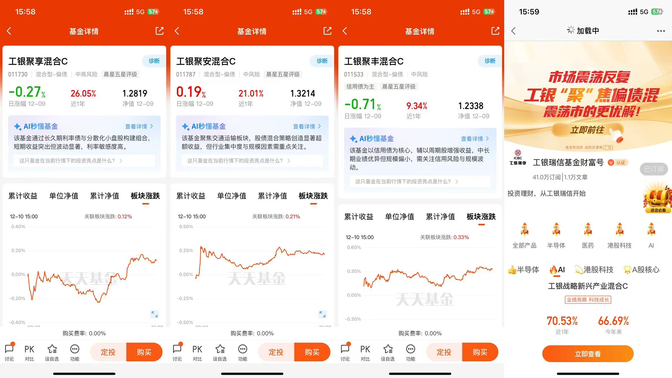 从流动性角度看,三只基金均支持开放申购和赎回,但规模差异显著影响流动性风险。工银聚丰混合A最新规模为1.32亿元,工银聚安混合A最新规模为1.01亿元,均属于小型基金。小型基金在面临大额申赎时,可能因流动性不足导致净值波动,特别是对于工银聚丰混合A,其股票投资占净资产比例达38.29%,债券投资占73.32%,现金及其他资产占-14.32%,表明其可能通过杠杆操作增强收益,但也增加了流动性风险。相比之下,工银聚享混合C的规模未明确披露,但其前十大重仓股集中度仅为18.7%,且通过衍生品对冲风险,流动性管理能力相对较强。