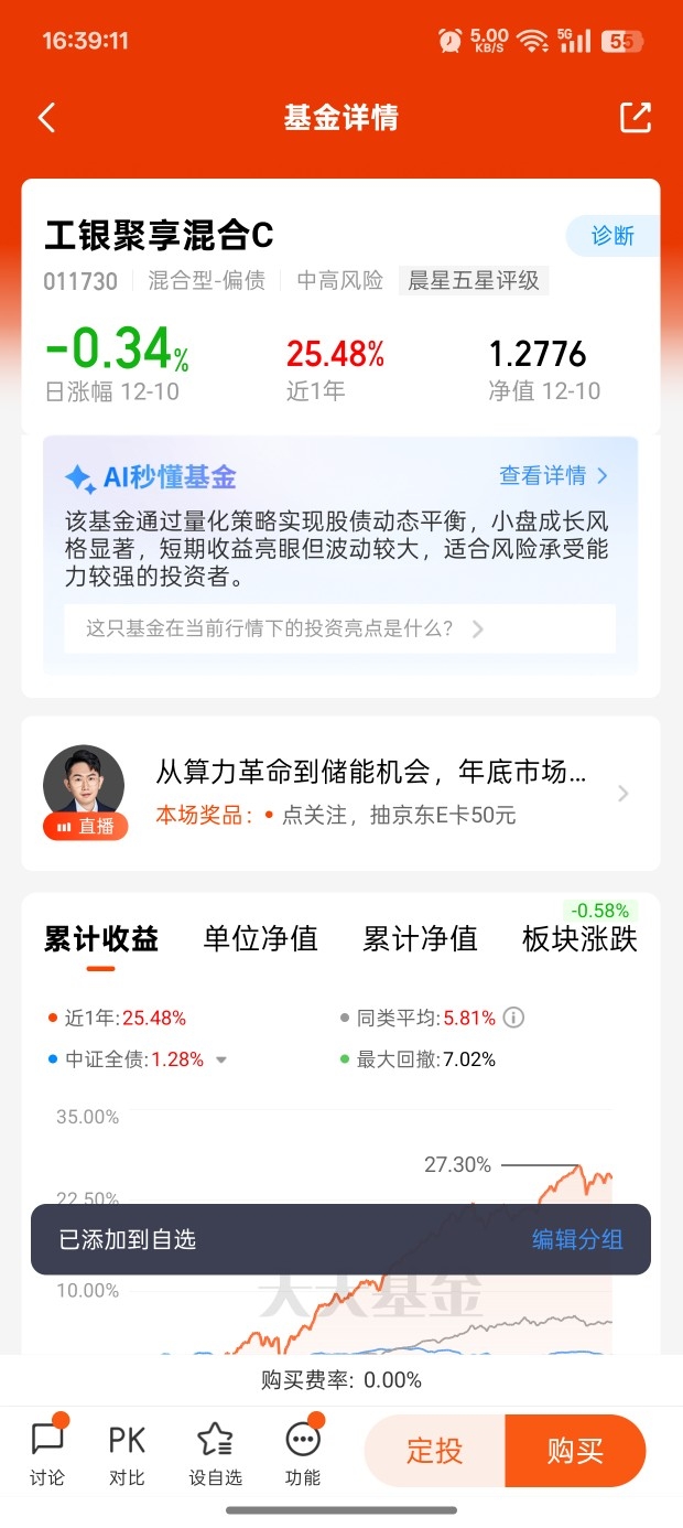 工银聚丰的“均衡价值+固收”策略,适合偏好“稳健均衡”的投资者。基金的权益部分覆盖价值、成长等多个赛道,持仓分散,波动较小,但在当前低利率环境下,均衡配置意味着难以集中把握估值修复的超额收益,收益弹性相对不足。