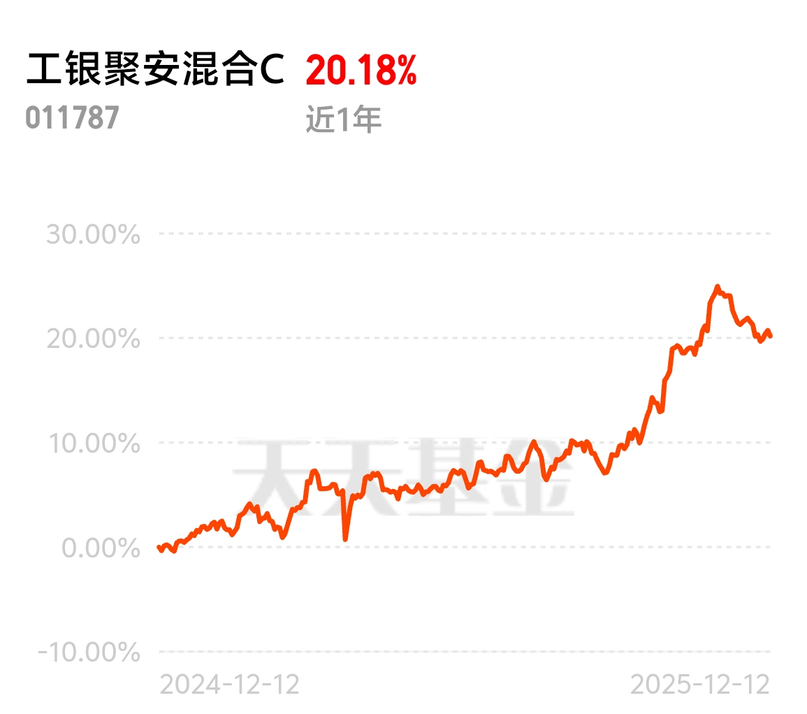 从业绩表现来看,工银聚安混合C的核心优势的在于“进攻有力、防守扎实”。作为偏债混合产品,其收益爆发力显著超越同类均值,数据显示2025年以来全市场偏债混合型基金平均收益为4.79%,前三季度平均收益亦仅6.47%,而该基金近一年20.18%的收益表现,相当于同类平均水平的4倍以上,收益弹性凸显 。更难得的是,基金在追求高收益的同时,风险控制能力同样出色。2024年四季度市场剧烈震荡期间,沪深300指数最大回撤达12.3%,而工银聚安混合C净值最大回撤仅为3.8%,大幅跑赢市场指数,展现出极强的抗风险能力,完美契合偏债产品“稳健为先”的核心需求 。