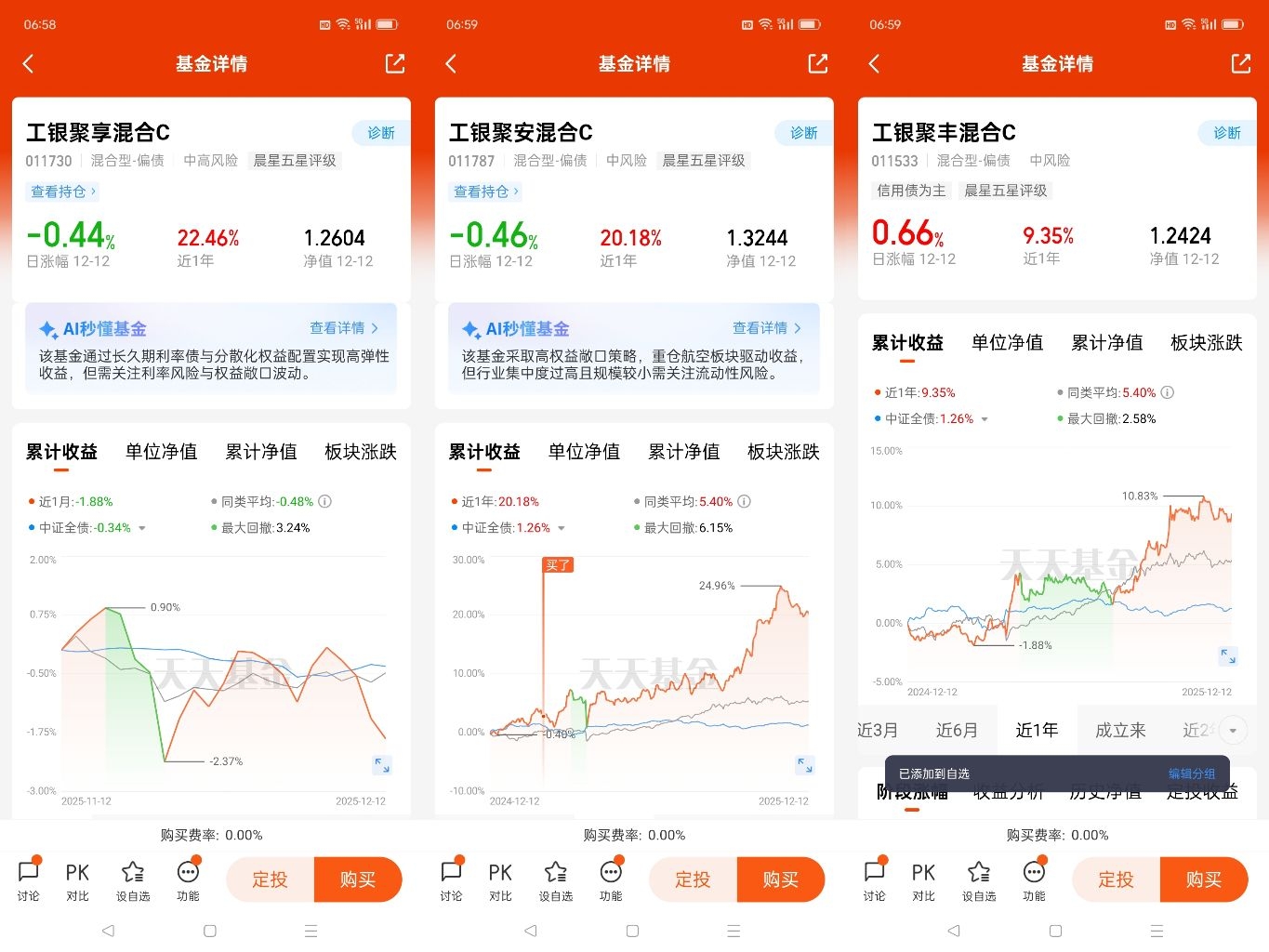 在低利率环境及震荡市中,工银瑞信旗下三只“聚”系列偏债混合基金,债券打底,权益增强,表现出色,皆凭借优异的业绩荣获晨星五星评级,是值得关注和长期布局的绩优宝藏基!$工银聚安混合A$2024年度收益率20.16%,在1373只同类基金中排名第1; $工银聚丰混合A$ 2023年度收益率8.76%,在1401只同类基金中排名第6;$工银聚享混合A$ 今年以来收益率29.19%,在1289只同类基金中排名前1%,超额收益显著!