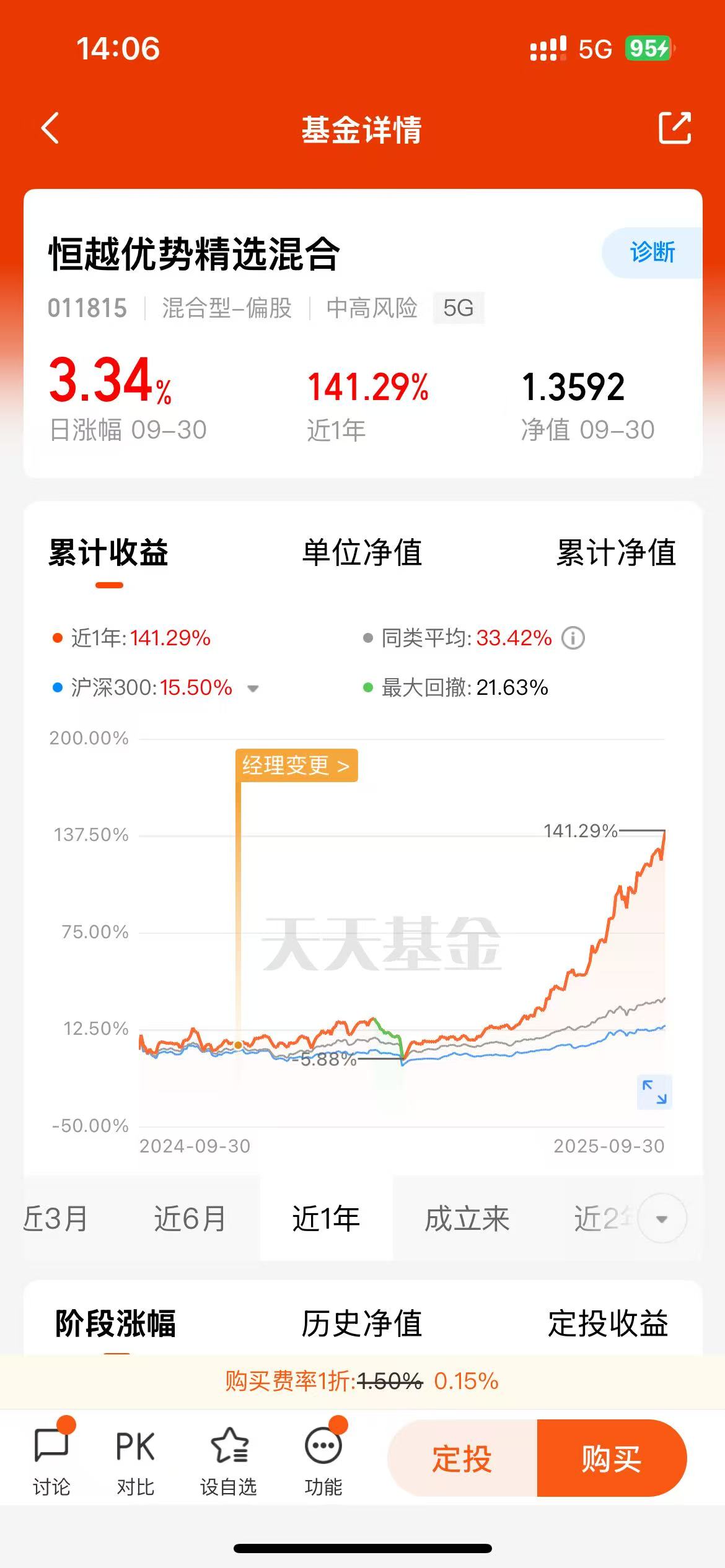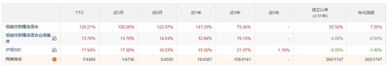 恒越优势精选混合基金的业绩表现极为亮眼。截至2025年9月30日,基金成立以来收益35.92%,今年以来收益128.21%,近一月收益19.87%,近一年收益141.29%,近三年收益73.46%。近一年,该基金排名同类18/4381,展现出色的投资能。