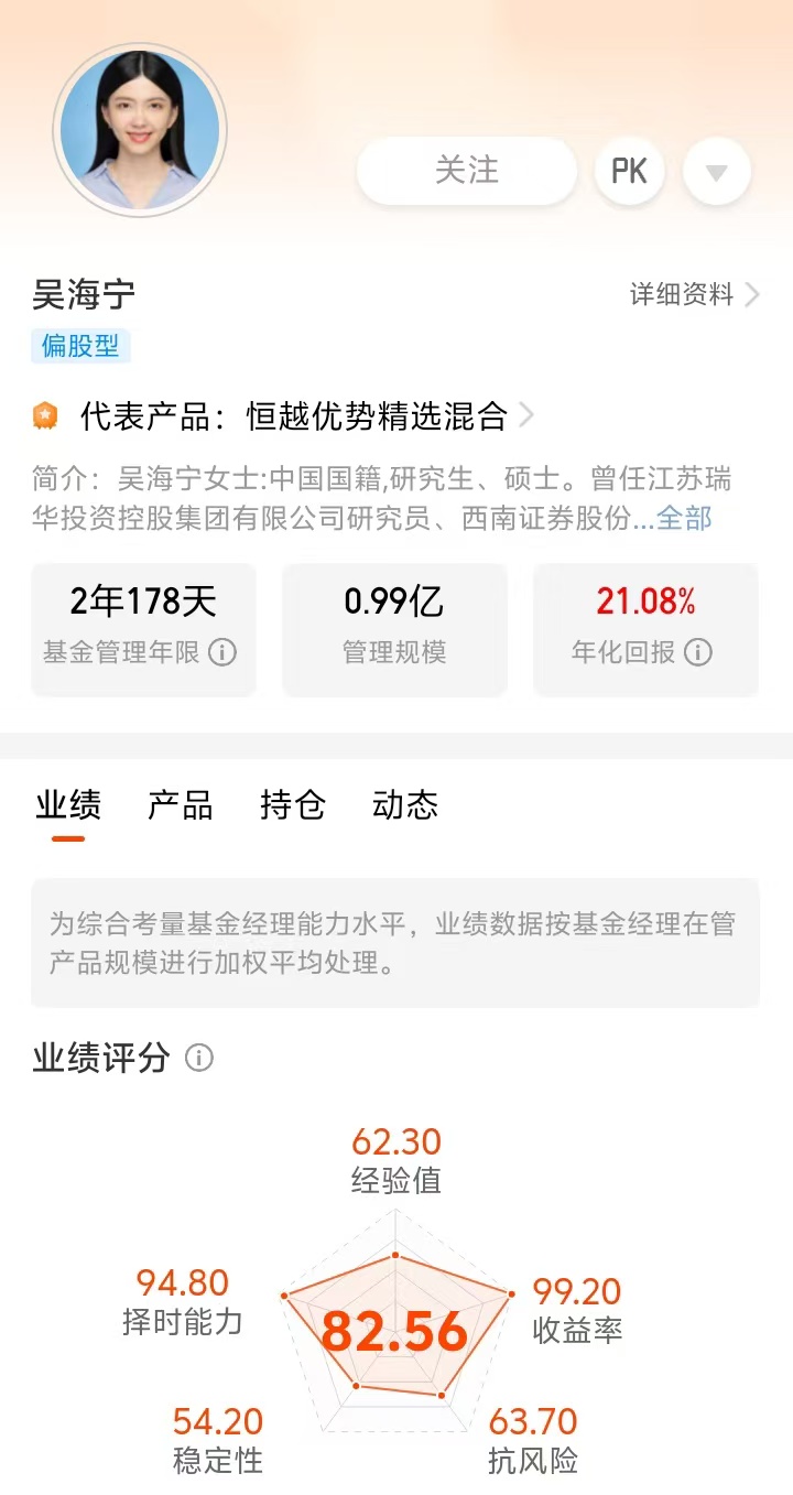 恒越优势精选混合基金现任基金经理吴海宁,曾在江苏瑞华投资、西南证券、上海混沌投资任研究员,在上海钦沐资产任投资经理,拥有丰富的投研经历。吴海宁的投资策略可概括为”自下而上择股+行业景气度判断”框架,坚持”好公司+好价格”的选股逻辑。她通过”五大指标”(行业中期景气度、远期成长空间、护城河与竞争格局、管理层优势、股价预期差)筛选优质标的,形成了独特的投资方法论。