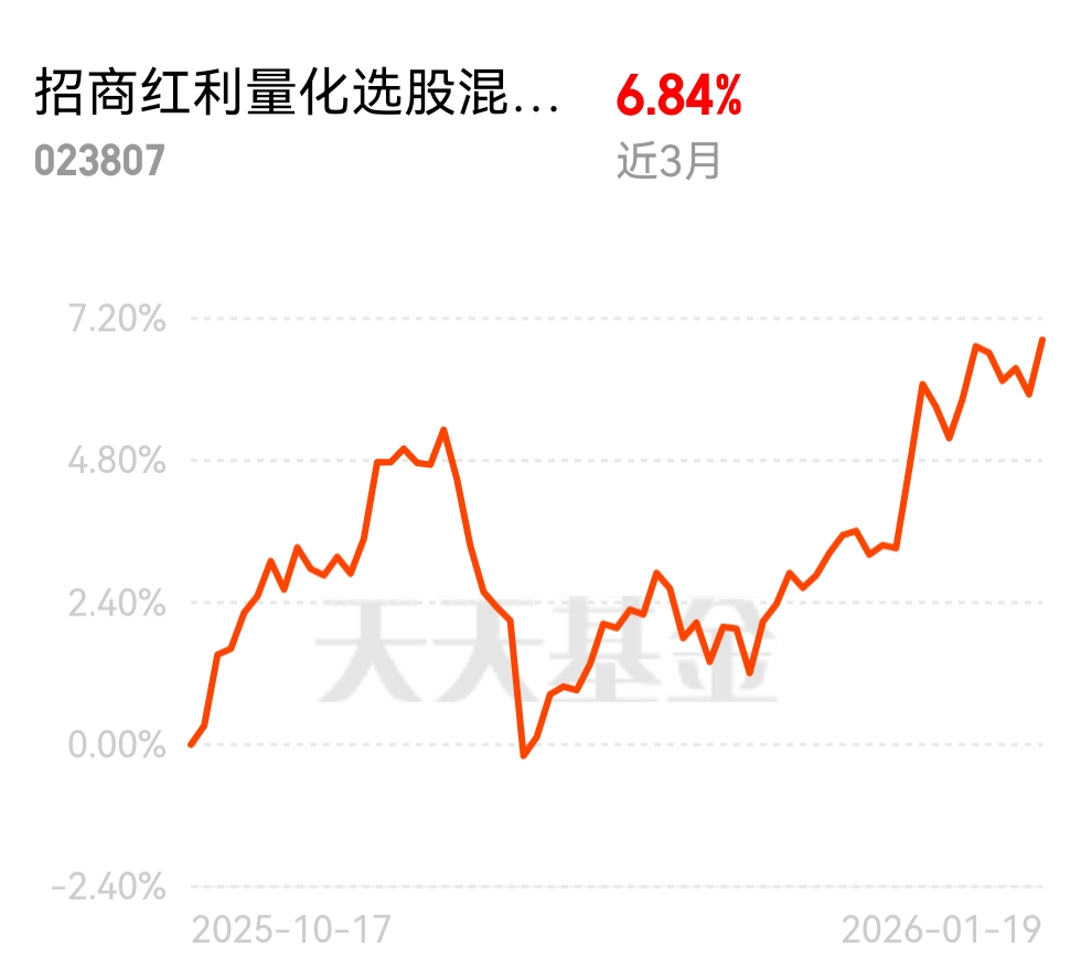 市场偏好稳健型基金,红利量化成配置首选,招商红利量化选股混合 C 太给力了!近 3 月涨 6.84%,近三个月大幅跑赢,超额收益近 10%,今日估值飘红,当成底仓配置心里超踏实。