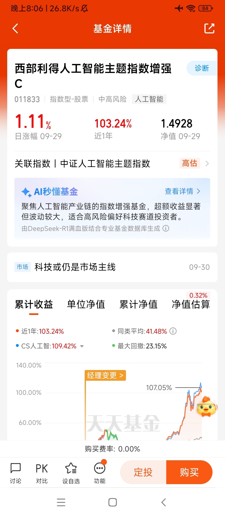 而$西部利得人工智能主题指数增强C$,恰好踩中了这一核心趋势。它以人工智能主题指数为跟踪基准,既能分享AI芯片、算法、应用场景等核心领域的行业红利,又通过“指数+增强”策略,在控制风险的同时追求超额收益。从市场逻辑看,当前AI产业链上游的算力需求持续爆发,中游的大模型技术不断突破,下游的行业应用场景持续扩容,整个赛道具备“政策支持+业绩兑现”的双重支撑;从产品特性看,C类份额免申购费、持有7天以上免赎回费,对于想在年底灵活布局、捕捉短期机会的投资者来说,成本优势尤为明显,能最大程度让利收益。