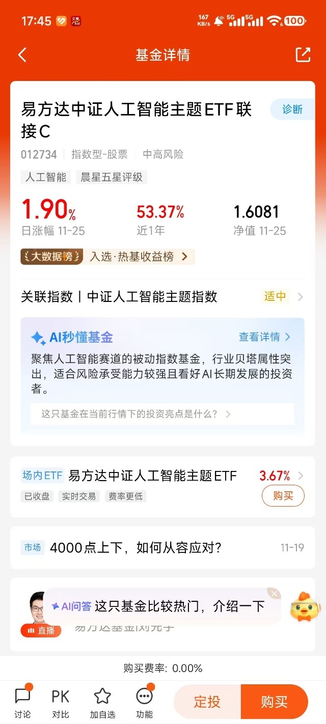 利好消息根本停不下来,AI + 工业互联网政策落地,传统行业智能化改造加速,加上 AI 芯片制程工艺突破,人工智能一路飘红,涨势惊人,不管是短期行情还是长期布局都值得把握$易方达中证人工智能主题ETF联接C$