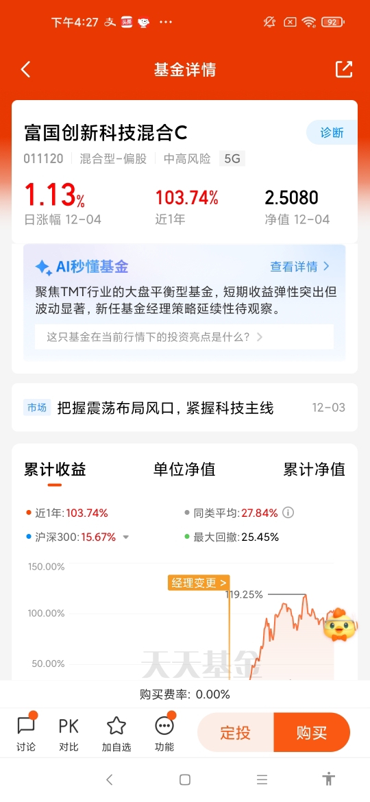 这阵子天弘人工智能C一直磨人,但手里配的富国创新科技C近1个月涨了3%,半年更是
