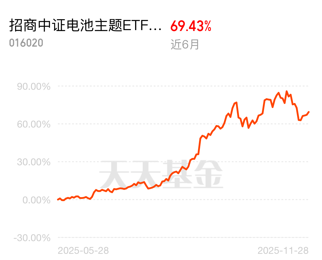 储能行业今年要实现四五十 % 增长,固态电池技术突破带动产业链上涨,电池板块成为焦点。招商中证电池主题 ETF 联接 C 近 6 个月收益 69.43%,行业高增长 + 估值不贵,长期投资价值凸显。
