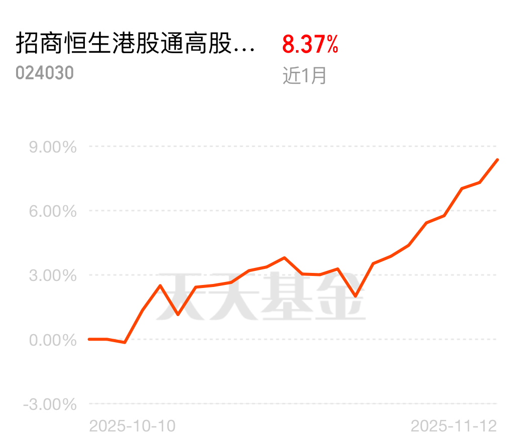 现在大家都怕投资踩雷,波动小、分红稳的产品才让人放心。招商恒生港股通高股息低波动ETF联接C近1个月涨了8.37%,跟踪的指数有6%高股息率,金融地产占比超60%,低波动还低费率,定期分红机制让长期持有更便利,做底仓太合适。