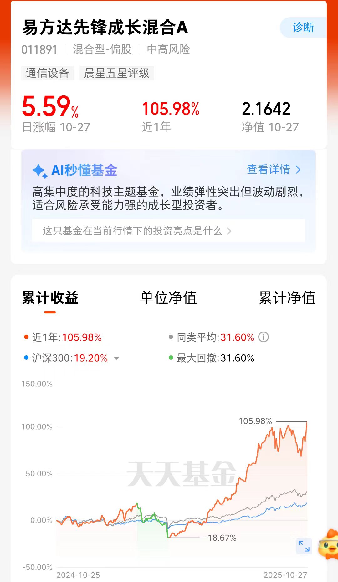 今天大盘指数震荡拉升,盘中集体翻红,牛市行情在继续。在成长行情下,$易方达先锋成长混合A(OTCFUND|011891)$爆发力很强呢。近半年上涨130.77%,长短期业绩都很优秀,,这是因为他的基金经理前瞻能力强,成立10年里紧密把控成长机会,长期走势强,跑赢同类呢。