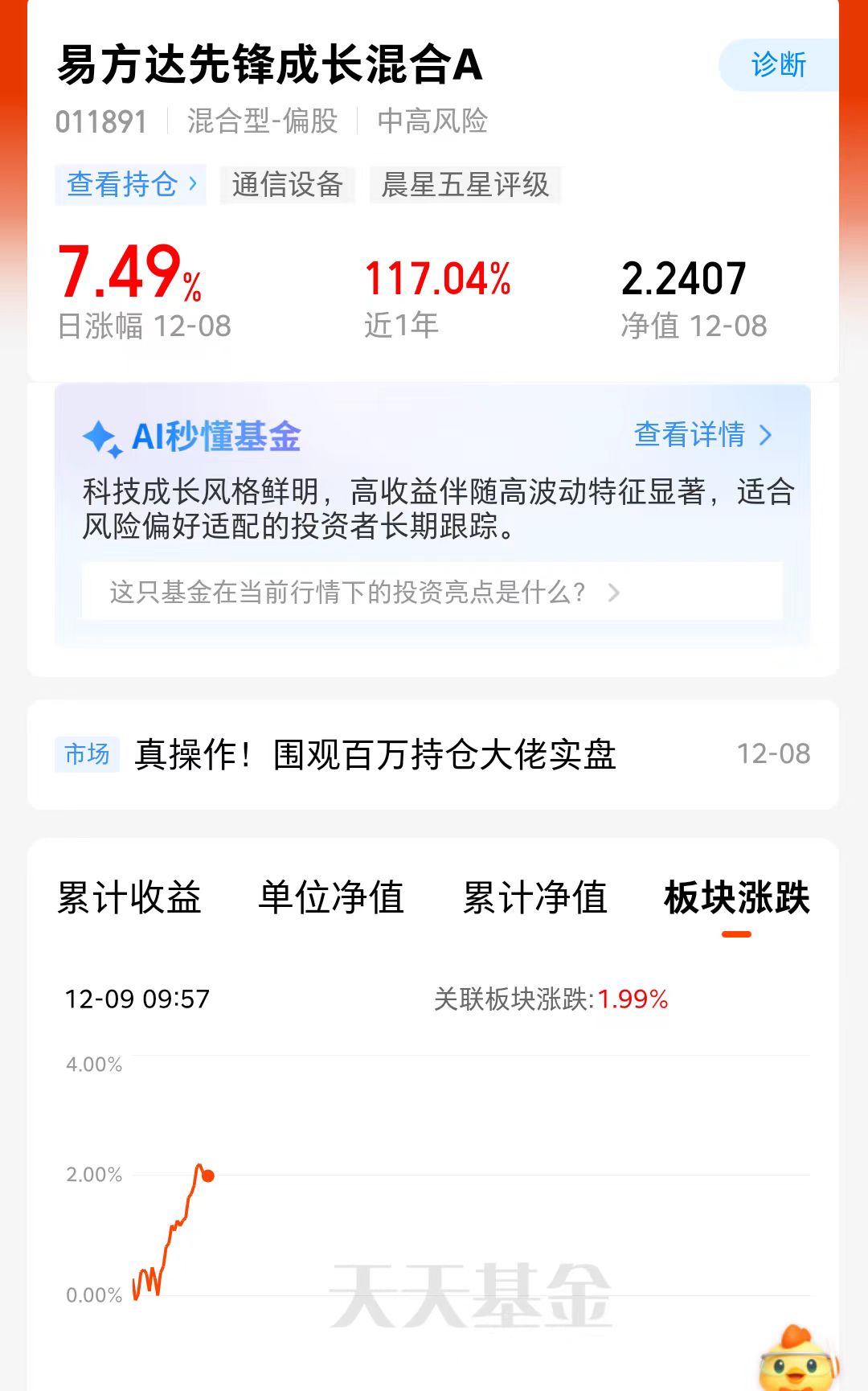 昨天股市行情稳步拉升,今天大盘指数低开震荡,没有按照我的预期继续反弹,不过也没关系,有回调才有更好的上涨,我之前加仓了$易方达先锋成长混合A(OTCFUND|011891)$,CPO行情回归,他昨天大涨7.49%,业绩能力强。