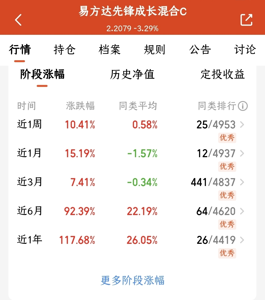 今天就要把昨天失去的拿回来。今天股市震荡,探底回升。$易方达先锋成长混合C$ 表现不错,估值上涨两个多点,晚上又可以吃肉了!最近虽然参加轮动,但是AI带动算力需求,CPO行情重启。易方达先锋成长混合C近一年涨幅达117.68%。该基基金经理眼光毒辣,精准,成立十年来把握成长机会,长期走势稳健,行情爆发力优于同类产品。