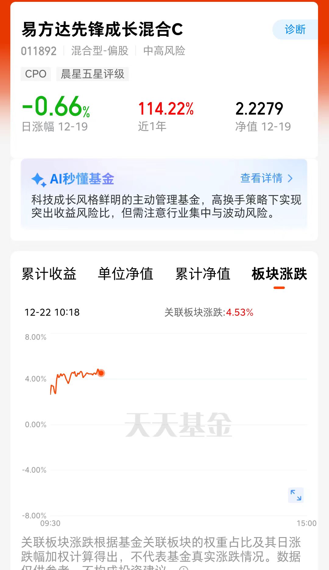 今天大盘指数继续拉升上涨,科技板块也继续反弹,CPO行情重新启动,我持仓的$易方达先锋成长混合C(OTCFUND|011892)$近一年上涨114.22%,他的基金经理前瞻能力强,成立来10年里紧密把控成长机会,长期走势强、在成长行情下爆发力强,比同类都优秀呢