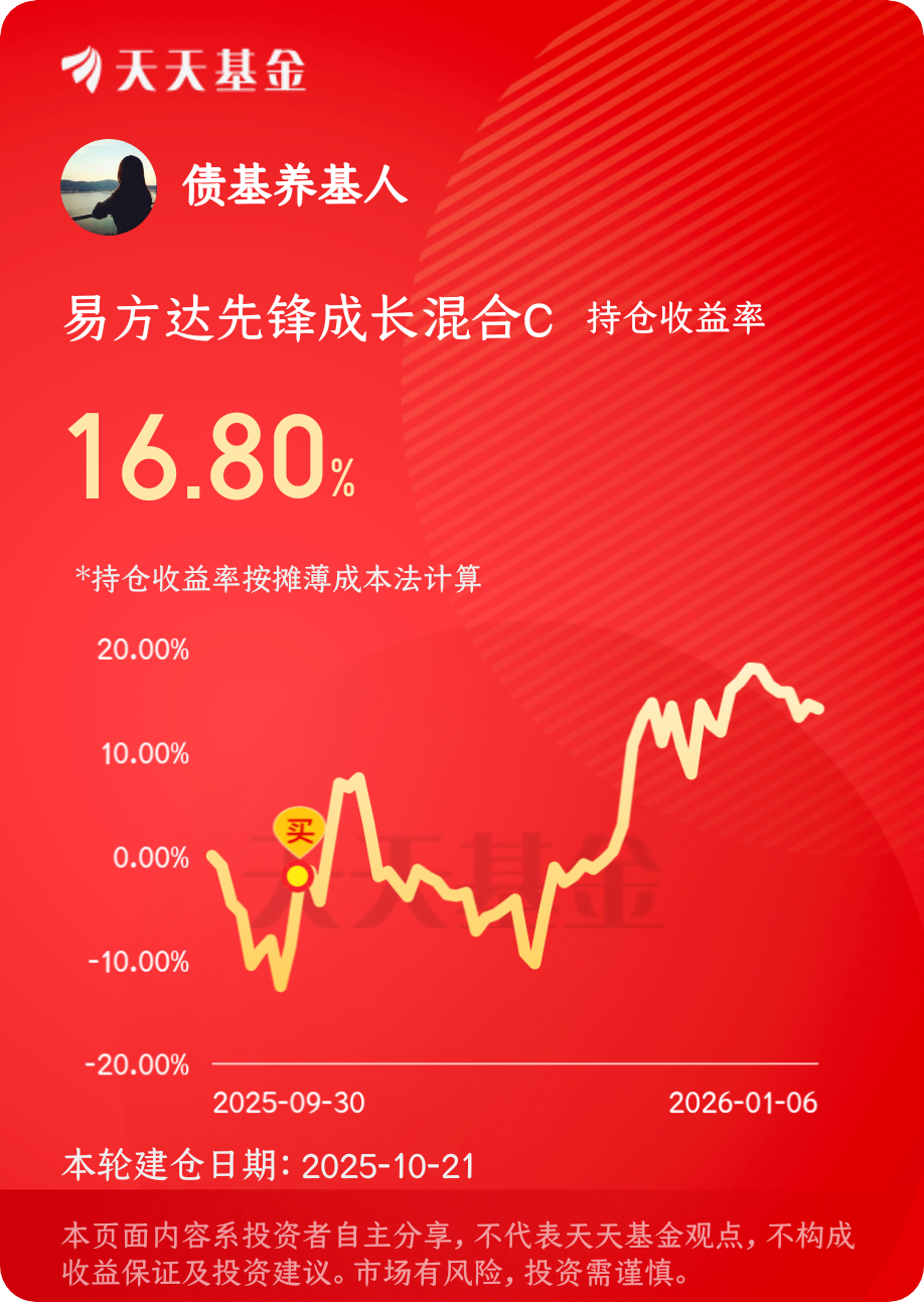 #晒收益# 今天股市冲高回落,$易方达先锋成长混合C$ 倒是好起来了,目前估值1.58%,还是很强势的,昨天小跌,今天大涨,真是赚了。买入也有一段时间了,目前持有收益率16.8%,我还是比较满意的,继续持有了!