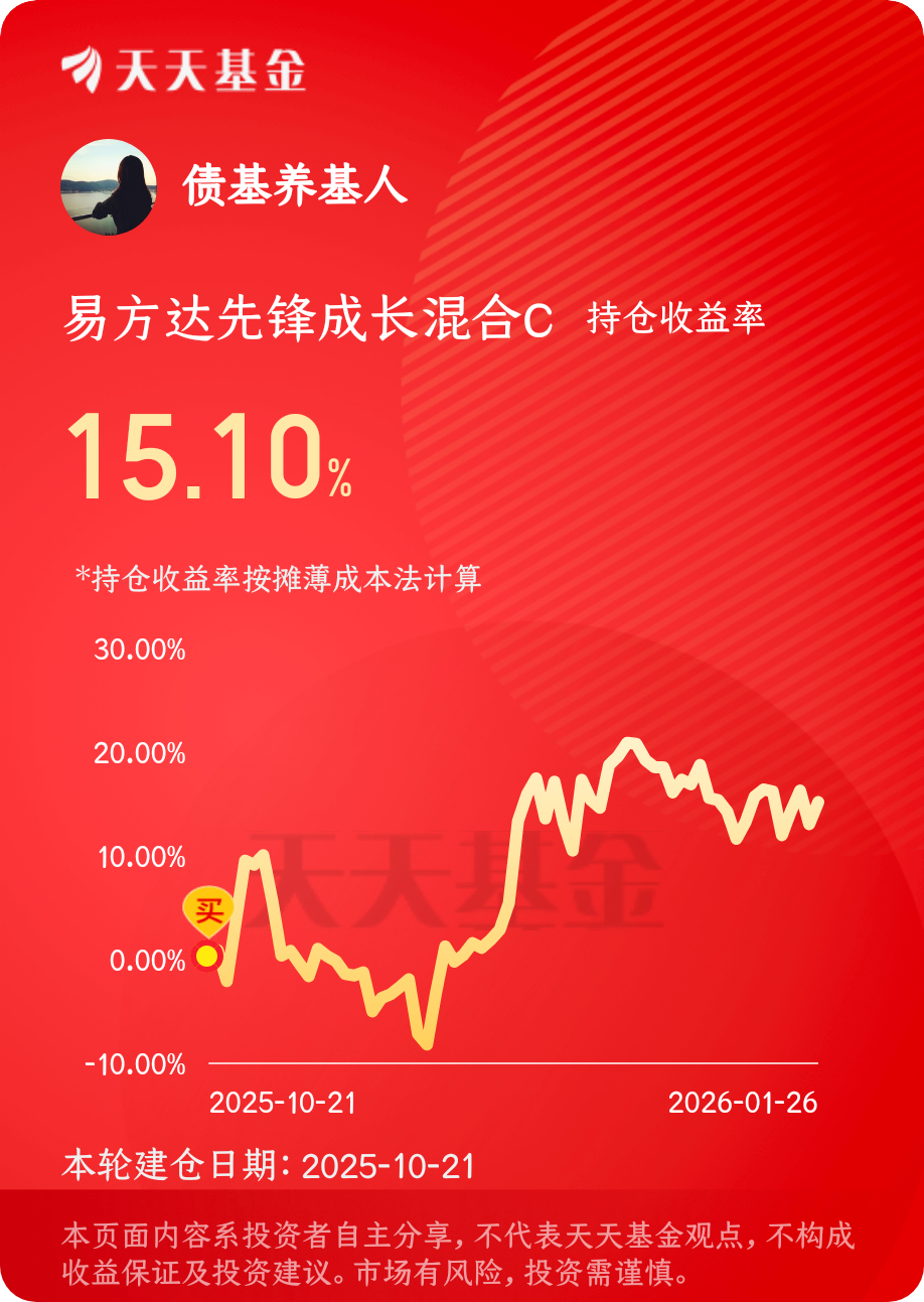 昨天股市高开低走,板块轮动加快,行情分化,不过cpo逆势上涨,表现亮眼。$易方达先锋成长混合C$ 昨天上涨了1.88%,还是很不错的,今天估值上涨2个多点,晚上又可以吃肉了!虽然现在震荡行情,不过长期看好!#晒收益#