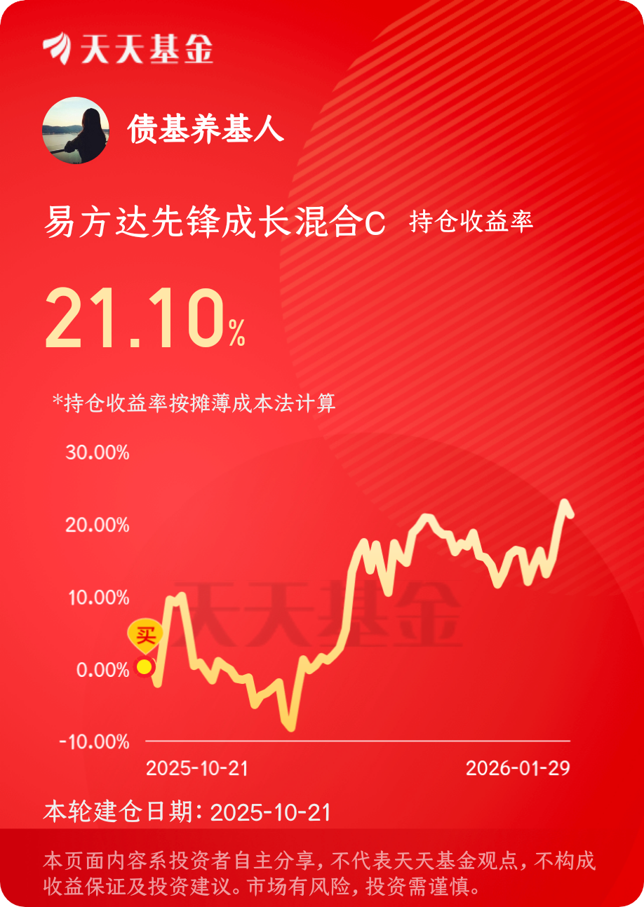 今天股市低开低走,波动较大,行情分化明显,好在探底回升,拉升不少,其中cpo行情重启,领涨全场。我持有的$易方达先锋成长混合C$ 今日估值大涨,目前持有收益率已经21个点了,最近涨幅不错,晚上又可以吃肉了!#晒收益#