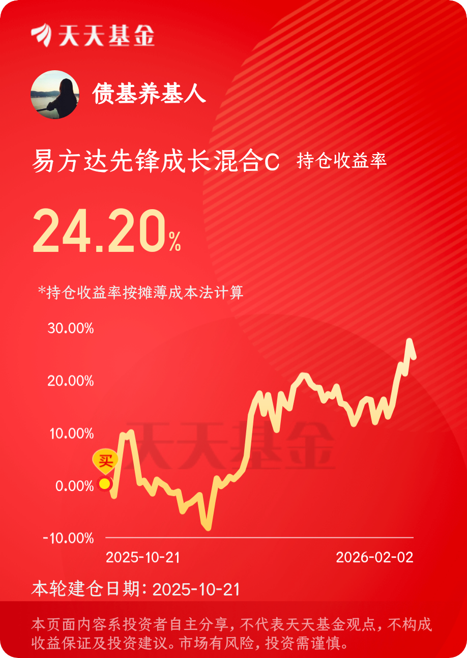 最近股市震荡,调整不少,不过cpo板块还是比较稳的住的,今天也是领涨全场。我持有的$易方达先锋成长混合C$ 最近表现不错,涨多跌少,收益稳定。#晒收益# 持有收益率也达到了24.2%,真心不错啊,今天晚上又可以吃肉了!
