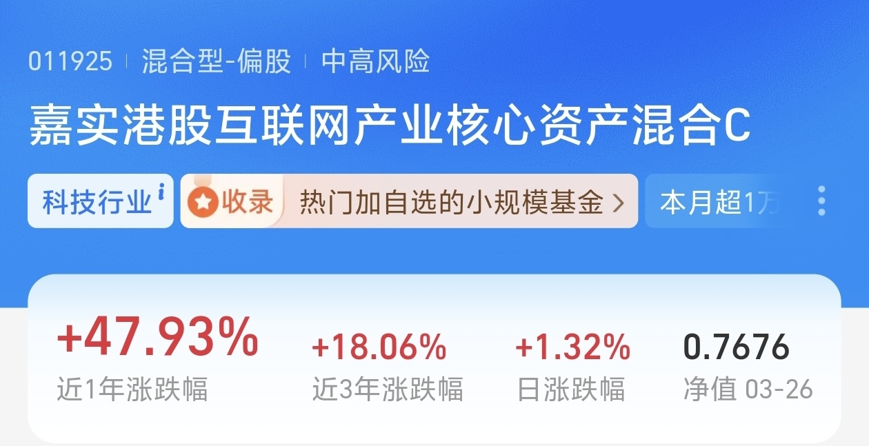 $嘉实港股互联网产业核心资产C$ 该基金盈利能力也挺强!昨天单日上涨了1.32%,近三个月上涨了24.27%,近六个月上涨了34.97%,近一年的收益率高达47.93%,收益率高!在同类基金排名领先,该基金主要的投资也是一些港股龙头企业,比如阿里巴巴、小米集团、美团、腾讯,中芯国际等。今年以来,南下资金大量的流入港股。今年的deep seek催化人工智能浪潮,港股资产也迎来了全面的重估!目前,香港科技股的估值仍有上涨的空间,期待后续行情的收益!