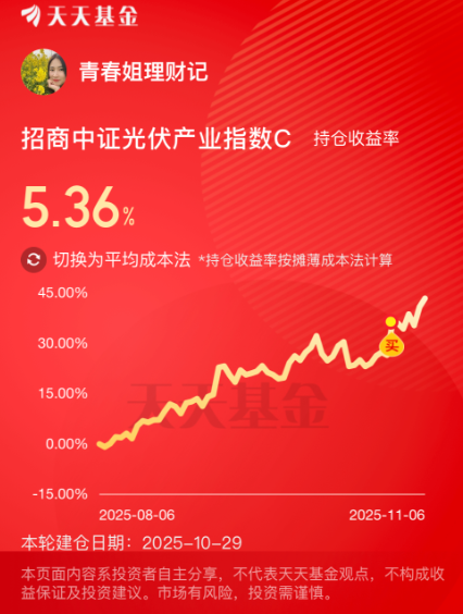 我加仓$招商中证光伏产业指数C(OTCFUND|011967)$1000元,跟踪的光伏产业指数大涨2天后,今天盘中再度涨超2%左右,这是要接力主线行情了,目前光伏估值处于近10年低位,长期持仓安全边际比较高,趁这会看涨幅回落至1.4%左右,我果断上车一笔,