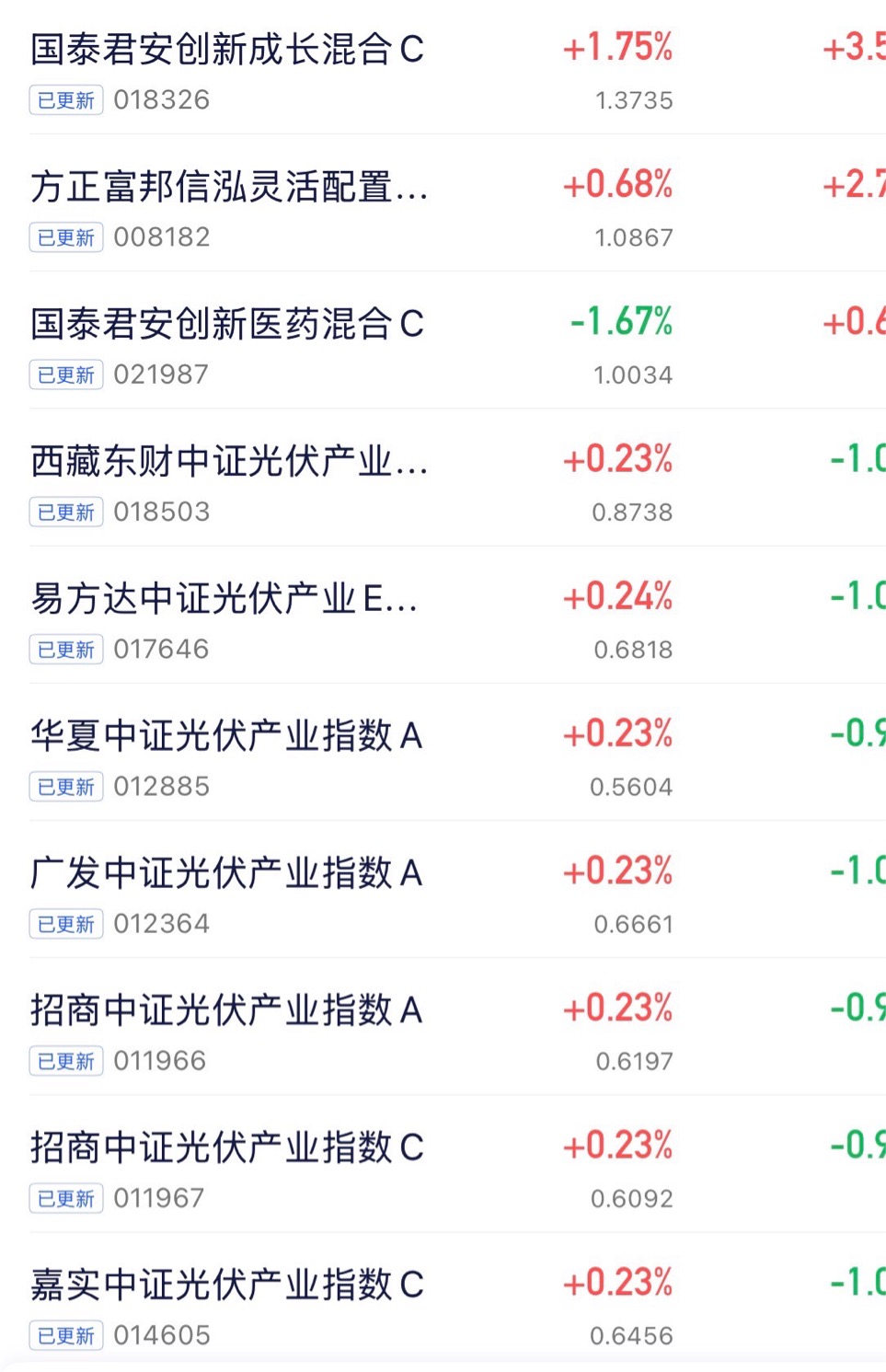 $招商中证光伏产业指数C$ 上涨0.23%$嘉实中证光伏产业指数发起式C$ 上涨0.23%$国泰君安创新成长混合发起C$ 上涨1.75%